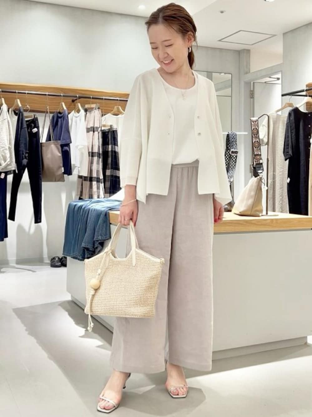 【インナー】 0(S)サイズ着用 体のラインをひろいにくく、ブラウス素材のタンクトップ。薄くて涼しいです! ワイドパンツとのコーディネートには、 インして着ることで スッキリとした印象に。 【カーディガン】 毎年人気のサラッとカーデ。 ストレッチ入りで、シワになりにくく、 どんな素材にも相性が良い万能カーディガン。 普段使いにしやすいアイテム。 【パンツ】 0(S)サイズ着用 定番のウエストリブパンツ。 0(S)サイズ 1(M) 2(L) ウエストゴムで楽ちん。 少しポリエステルも入ることで ストレッチ効果も。 2色、3色まとめてお買い物される方も多い、履くとやめられないパンツです!
