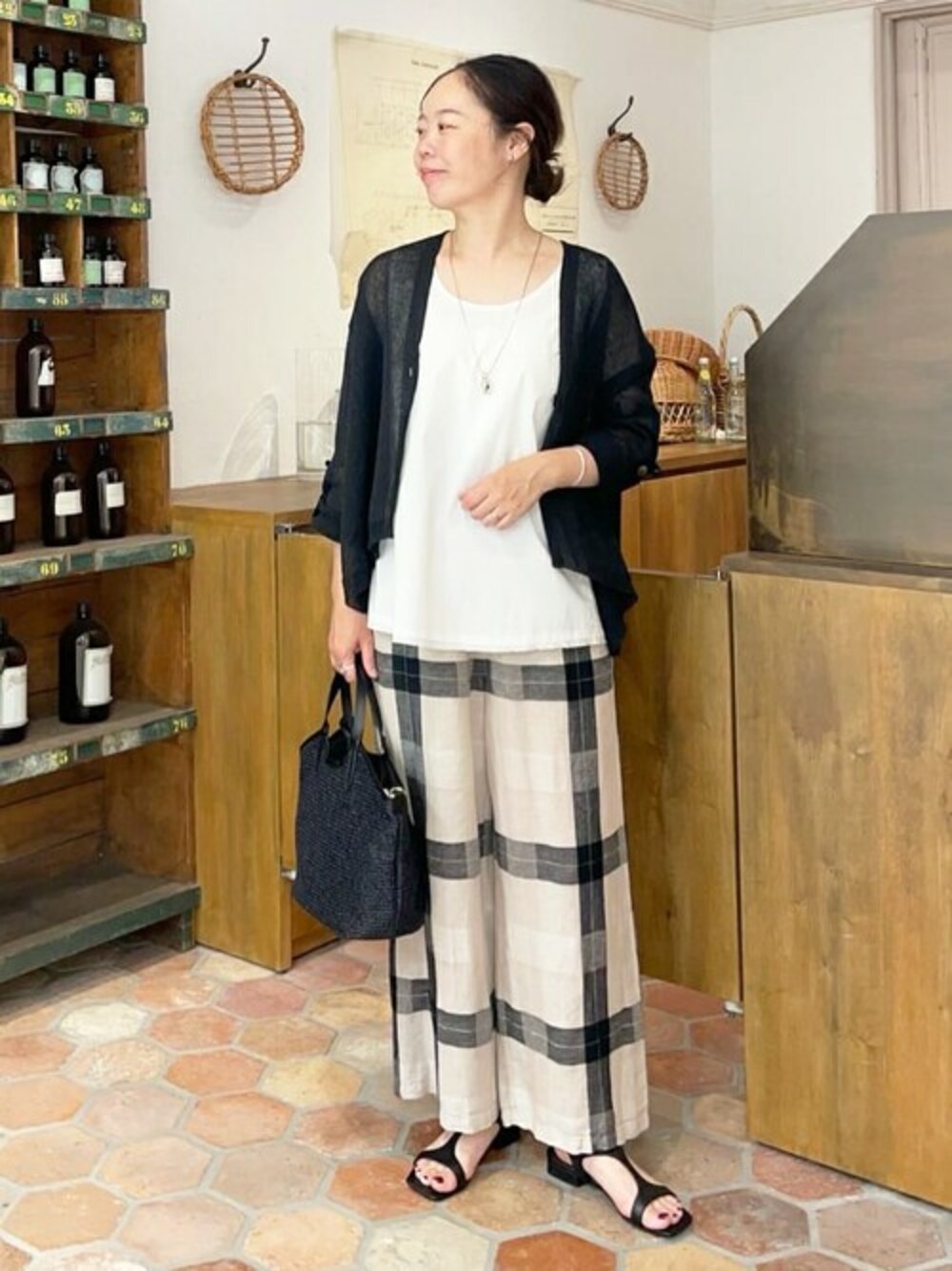 【パンツ】1サイズ着用 大人気のウエストリブシリーズのチェックが待望の入荷です♪ 今回の生地はとにかく軽い! 穿いてない!?って思うぐらい着心地良いですよ。 裏地ナシですが、着用時透け感は気になりませんでした。 念の為、ペチコートを穿いていただくと室外の明るい場所でも安心かと思います。 【シャツタンク】0サイズ着用 ストレッチが効いたシャツ生地です。 シャツ生地なので一般的なタンクトップに比べて、身体のラインを拾いにくいです♪ カーディガン合わせの時などなど、インナーを見せて使いたいときに大活躍します。 裾のデザインも可愛いので、短めのトップスに重ねて、裾だけ見せるのもおすすめです。 【リネンカーディガン】Fサイズ 涼しく着られて、暑い時期の羽織りにおすすめのカーデです。 ワイドパンツやスカートなど、ゆったりめなボトムが多い方は重宝しますよ。 後ろから見た時のVネックが綺麗なところが私のお気に入りポイントです♪