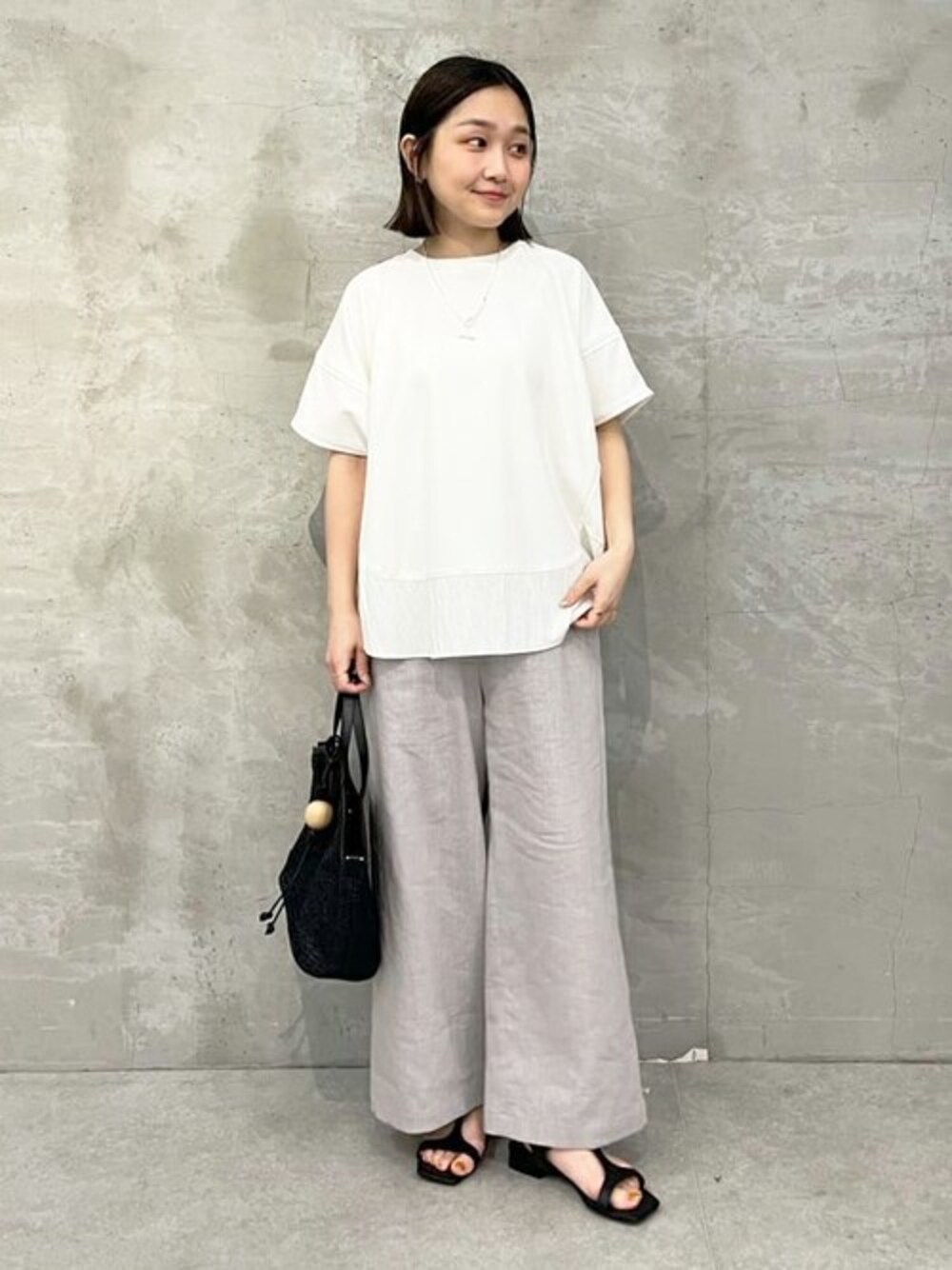【トップス】 大人気のTブラウスと同じく、ストレッチ抜群で透けにくい素材を使用した半袖トップス。 背中にはタック入り、裾には異素材を組み合わせて単調にならないデザインと、低身長でもバランスがとりやすいサイズ感です。 コットンのTシャツよりきちんと感を演出してくれ、洗濯の型崩れも起きにくいのも魅力です。 【パンツ】着用サイズ:0 定番ウエストリブパンツのリネン素材。 リネンですがストレッチが効いていて、やわらかいので着心地も肌触りも良いです。 Tシャツ合わせなどシンプルコーデも涼しくかつオシャレ見えするので、リネンボトムは一本抑えておきたいアイテムです!