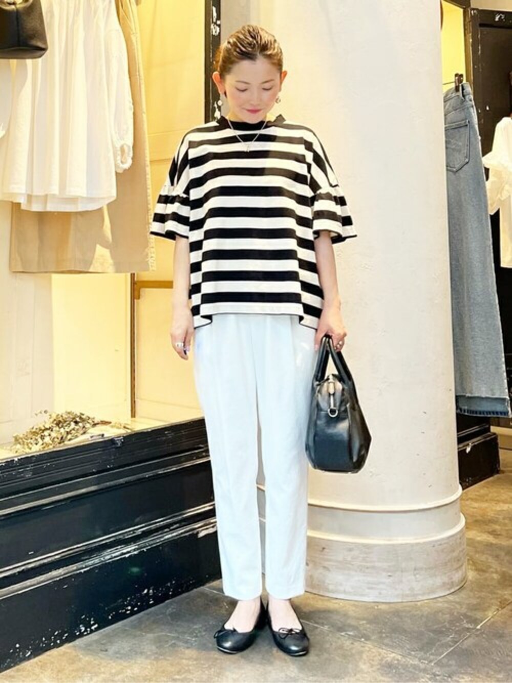 【tops】着用サイズ F size お袖のフレアが可愛い一枚 長すぎない着丈ででスカートやワイドパンツなどとも合わせやすいデザイン これからの時期に重宝する一枚です。 【pants】着用サイズ 0size スッキリとしたシルエット足がキレイに見えるパンツ ウエストゴムで楽ちん 紐で調節出来るのでスッキリ着れるのも嬉しいポイント ストレッチが効いていて穿きやすく動きやすいパンツ