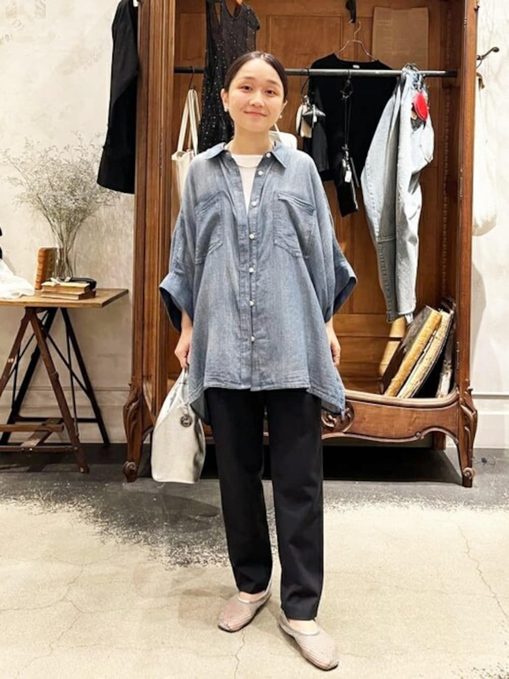 【シャツ】 透け感のあるシフォンデニム素材を使用したシャツ。軽やかで柔らかい素材がデニムのカジュアル感を抑えてくれます。 薄手なので夏の羽織りとしても重宝でき、 脱いだときも嵩張りません。 149cmで太ももにかかるくらいの着丈でした。 【pants】着用サイズ:0 ストレッチが効いたテーパードパンツ。 さらっとした素材で肌離れが良く、涼しくお召しいただけます。 ハイウエストで着用し、くるぶし下くらいの着丈でした。ウエストに紐が付いているので調整可能です。
