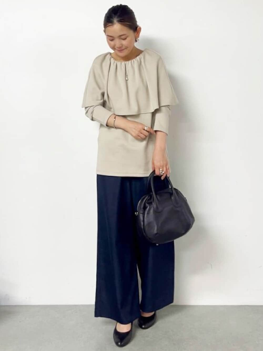 【tops】着用サイズ F size フリルが女性らしく 着るだけで大人カジュアルが決まるアイテム 柔らかな着心地で 程よく厚みがあり落ち感の綺麗なニット 首開きはゴムなので脱ぎ着もしやすいデザイン スカートやワイドパンツにタックインするなど さまざまなコーディネートを楽しんでいただけます。 【pants】着用サイズ 1size ツヤ感の綺麗なパンツ デニムのようなカラーですが カジュアル過ぎずに上品に穿きやすい一枚 ウエストが総ゴムで穿きやすく 着脱もしやすいのも嬉しいポイント シワになりにくく 長く座っている時や旅行などにもおすすめです。
