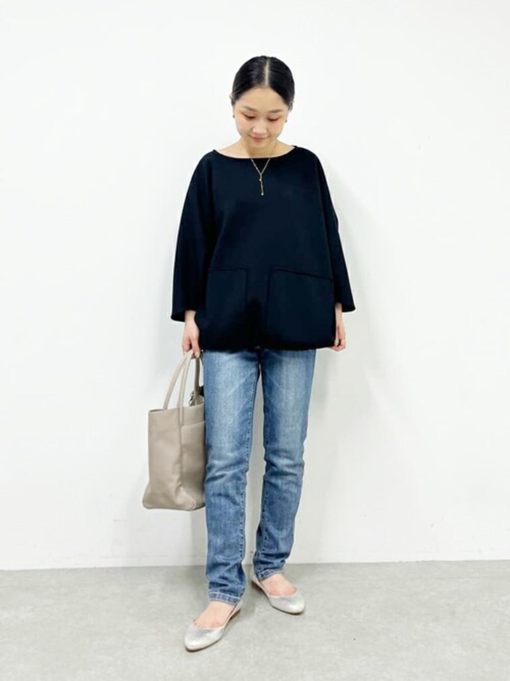 【トップス】 ゆったりしたシルエットですが裾はドロストコードで絞れるデザインなので低身長でもバランスが取りやすいです。 袖丈も手に掛からない長さでした◎ ハリのある素材で高見えし、同素材のパンツとセットアップ着用もおすすめです。 【パンツ】※サンプルの為1サイズ着用。 定番のデニムパギンス。 伸縮性に優れ、窮屈感のないストレスフリーな履き心地です。 チュニックやワンピースの下に合わせるなど一本持っていれば間違いないアイテム。