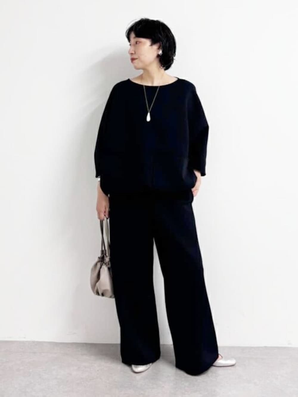 こちらのシリーズは軽くて締め付けのない着心地。 パンツも楽ちんで、 セットアップで合わせたトップスは、 裾にドローコードがあるので、 ギュっとしぼると雰囲気変えて着用していただけます。 セットアップできても、パジャマ感なくスマートに着ていただけます。