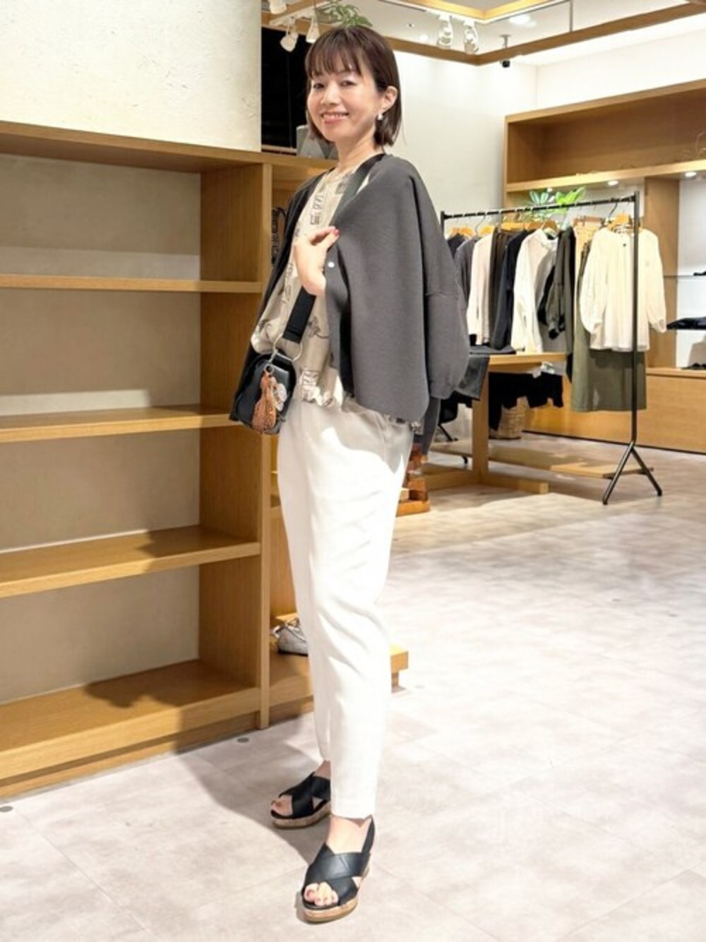 【パンツ】1サイズ着用 インディゴだとよりデニムっぽく見えますが、ホワイトはよりきれいめな印象。 ウエストが総ゴムで締め付けず、お腹周り楽ちん。紐で調節もできます。 シワになりにくく柔らかい素材で、裏地つきなので、透けが気になりません。白パンツ穿きたいけど透けが気になる方必見! 【カーディガン】Fサイズ 毎年大人気のサラッと素材のカーディガン。 見頃はゆったりなので、インナーにドルマンスリーブも着込めますが、七分袖ですっきり見えます。 フロントは短めなので、スカートやワンピースにも合わせやすく、うしろは長めでヒップが隠れますがスリットでしっかり抜け感が出せますよ! 肌に張り付かず、しわになりにくいので持ち運びしやすく冷房対策にもおすすめです。 【シューズ】Lサイズ 私は幅広めですが、幅のサイズは大丈夫でした。(普段スニーカーは24.5cm、サンダルは24cmが多いです) 厚底なのでスタイルアップして見えますが、とても軽いです!ウェッジソールは底が前側も厚みがあるので、安定感があって歩きやすいです。 【ブラウス】Fサイズ 世界で活躍する版画作家、西脇光重さんのアートワークがとっても「チャーミング」で唯一無二!バルーンシルエットがリラックス感を高めつつ、柔らかさのあるコーディネートに。 リネン素材で涼しいです。