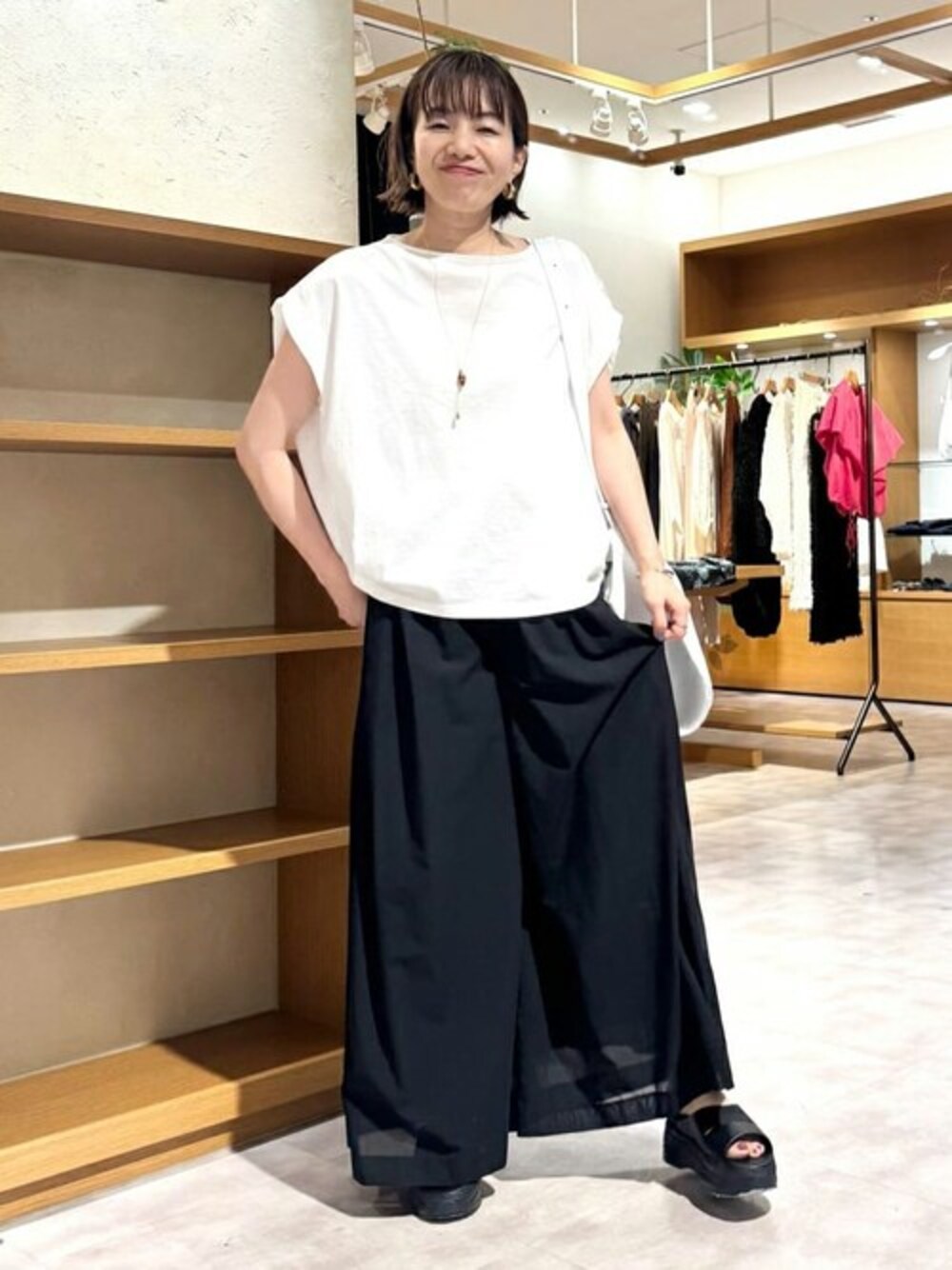 【カットソー】Fサイズ 細い糸で織られたさらさらの肌触りのカットソー。襟元が開き過ぎず、詰まり過ぎずでほどよく抜け感が出せます。 裾の両端を軽くつまんであり、インしなくてもインしてる風に! 袖は斜めにカッティングされたシルエットで、腕をすっきり見せてくれます。 【パンツ】1サイズ着用 ウエスト後ろがゴム。薄くて涼しいので、インナーパンツがついてきます。 ギャザーでふんわりしたシルエットになり、リラックス感のあるコーデに仕上がります。 【サンダル】23.5cm 厚底で足元にボリューム感を出してくれます。 レザー素材が、アラフィフさんにもカジュアルすぎなくて合わせやすい。 普段私はスニーカー24.5、パンプス24(37インチ)が多いですが、このサンダルは幅広めなので、このサイズも履けました。