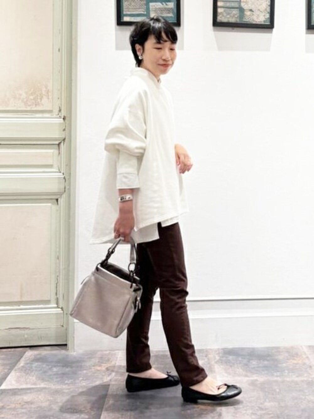 【コットンパギ】着用サイズ1 新色のブラウンは、 柔らかい上品な印象に。 また、生地も柔らかく伸縮性もあるのでノンストレスで履けます。 しかも着痩せ効果もあって嬉しい。 【トレーナー】着用サイズF ・サイドジップがあしらわれたトレーナーは、 ファスナーをあげることで抜け感をだせます。 カジュアルコーデをした時に、〝ただ着ただけ感〟 が出やすいトレーナーですが、このファスナーがあることでオシャレ見えします♪ ・BA(ビアズリー)の刺繍もあるのもポイント。 これだけでも、〝脱カジュアル見え〟します。 特にグレーのトレーナーってスポーティに見えますが、シャツやブラウスをレイヤードすると、一気にこなれ感でますよ。 【シャツ】 ポンチョのようかシルエットのシャツ。 肌に張り付かない、さらっとした着心地でとても心地よかったです。 ほんのりツヤを感じられるので、 ボトム次第でキレイめにも、ラフな印象でも着られます◎ サイドにはスリットも入って、前後差があるので、どんなボトムとも相性ばっちり。 今回はトレーナーの下に着て、 レイヤードを楽しみました。