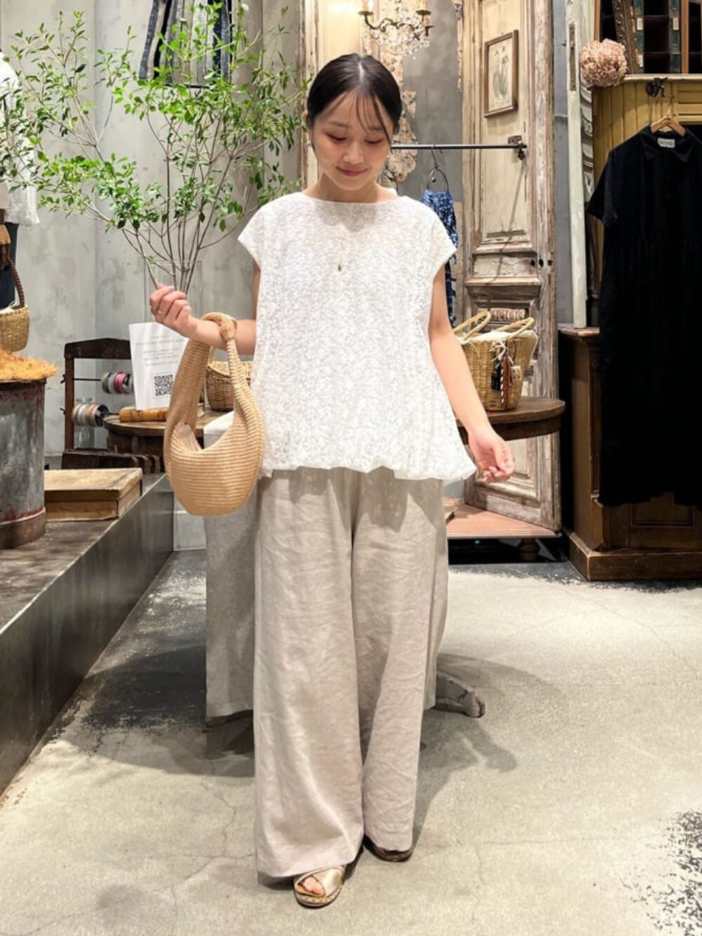 【トップス】 小花柄の刺繍が涼しげなトップス。綿100%の柔らかい裏地がついているので肌あたりも良く、汗を吸収してくれます。 低身長でもアレンジいらずでバランス良く着られ、一枚で着映えするトップスです。 【パンツ】着用サイズ:0 定番ウエストリブパンツのリネン素材。 リネンですがストレッチが効いていて、やわらかいので着心地も肌触りも良いです。 Tシャツ合わせなどシンプルコーデも涼しくかつオシャレ見えするので、リネンボトムは一本抑えておきたいアイテムです!