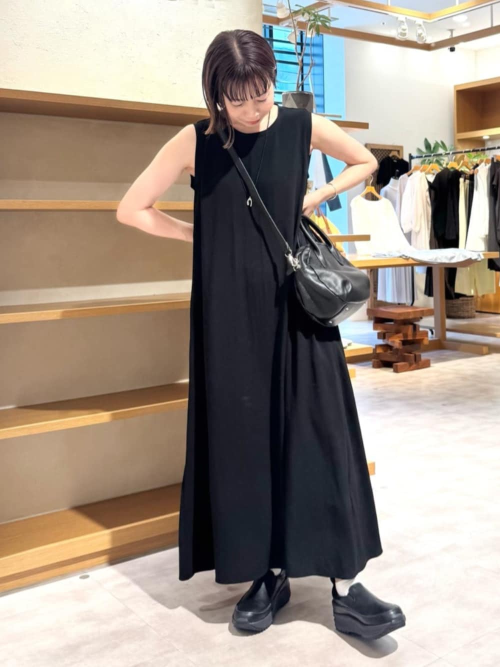 【ワンピース】1サイズ着用 うすくてさらさら、だけど透けずに着られるジョーゼット素材で、伸縮性があり着心地バツグン! おシワが入りにくく、かさばらないので旅行にもおすすめです。裾にかけてフレアになっていますが、ストーンと落ち感が良くて広がらず美しいシルエットが楽しめます。 【スニーカー】24.5cm 幅広めなので、幅広の私はいつものサイズで選んでいます。店頭では、甲高の方が一つサイズをあげていらっしゃっることがあります。 アッパーはレザー仕様できれいめカジュアルに仕上がるデザイン。厚底なのでスタイルアップして見えますが、とても軽いです! クッション性が良く、歩き疲れしにくいのでたくさん歩き回る日もおすすめです。 【バッグ】 大きすぎず小さすぎずの、絶妙なサイズ感が使い勝手の良いボストンバッグ。 シボ入りのレザーで、きれいめスタイルにも カジュアルスタイルにも合います。 マチがしっかりあるので、身の回りの荷物がたくさん入ります。レザーにしては重くないので旅行にもおすすめ。 ショルダーのストラップの長さが細かく調整できるのも嬉しいポイント!