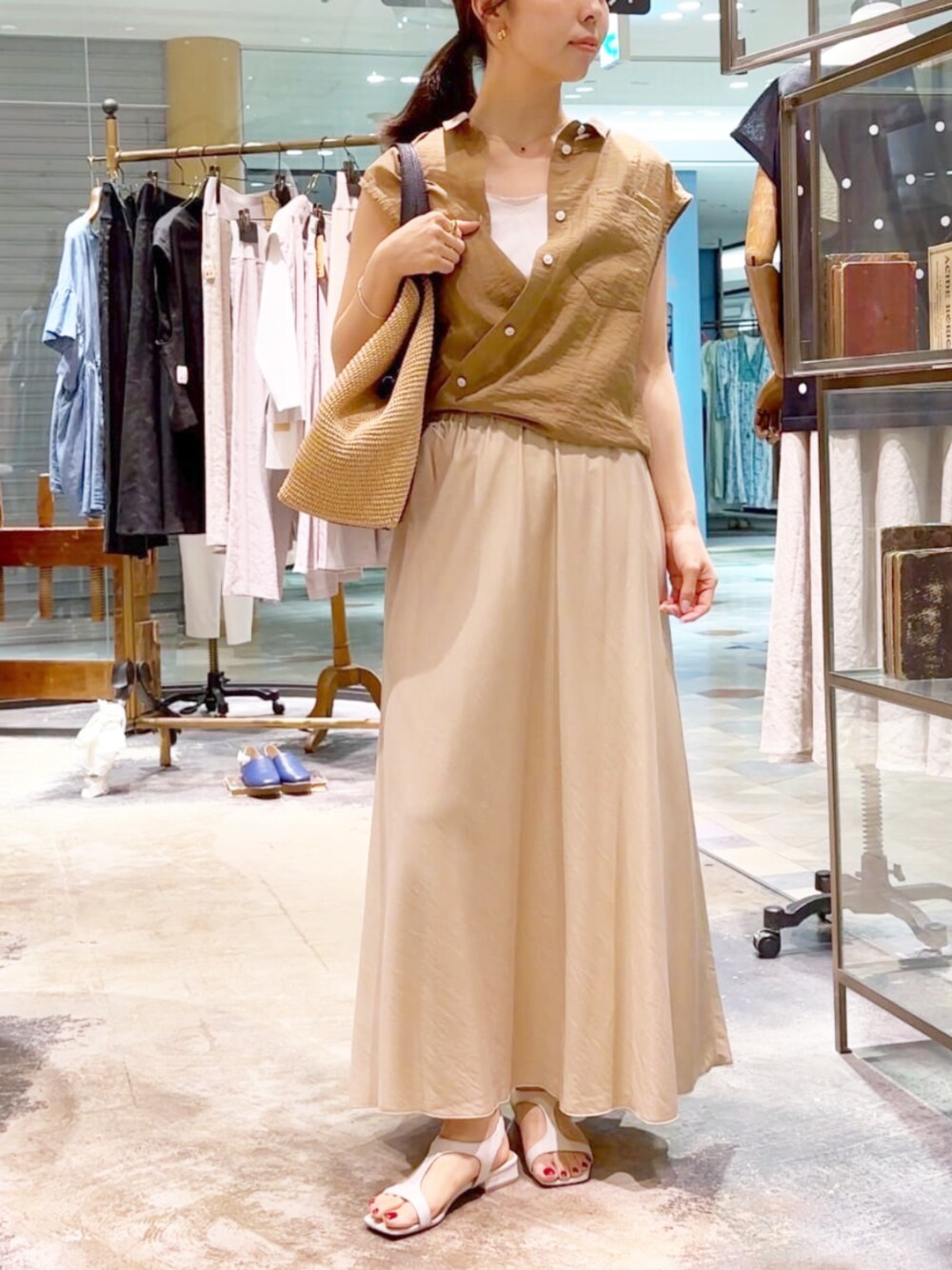 【shirt】Fサイズ カシュクール風にアレンジ。 ただインするよりもこなれ感が出るのと、 スタイルアップして見えるのでおすすめです。 裾の端を交差してインするだけなので、 簡単に出来ます◎ ぜひやってみてください! 【skirt】 着用0サイズ ウエストがゴム仕様のスカートで楽ちんに。 カットソーを合わせてもカジュアル過ぎないので 大人の旅行コーデにもおすすめ。