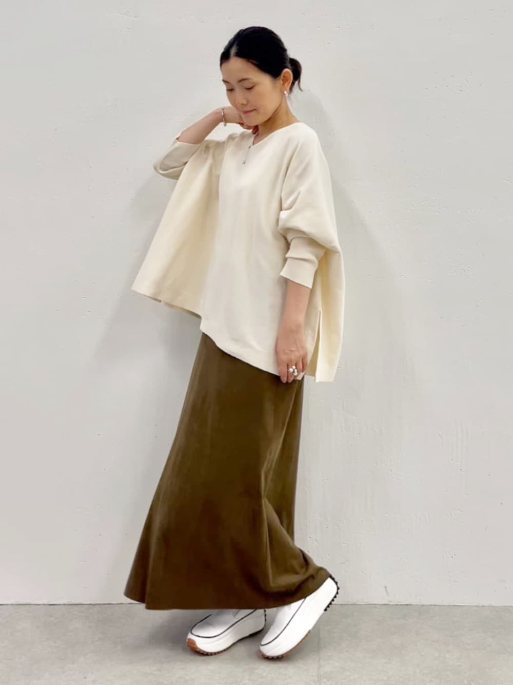 【tops】着用サイズ F size たっぷりシルエットのリラックスニット Vネックラインなので首周りもスッキリと着やすいデザイン 程よく厚みがありますが サラサラとした着心地なのでシーズン長く着やすいニット ヒップラインが程よく隠れる着丈で パンツやスカートなど さまざまなアイテムと合わせやすい一枚 お袖もリブがスッキリとしているのもメリハリがつくポイント 腕まくしやすくデイリーで使いやすいアイテムです。 【skirt】着用サイズ 0size スッキリと落ち感のある秋らしい生地感のスカート 腰回りスッキリしたシルエットで 女性らしく着やすいデザイン スウェード生地なので、肌着のラインはやや気になりにくい生地感になると思います。 スウェットなどと合わせてカジュアルにも綺麗にもコーディネートしやすく 秋に活躍するスカートです。