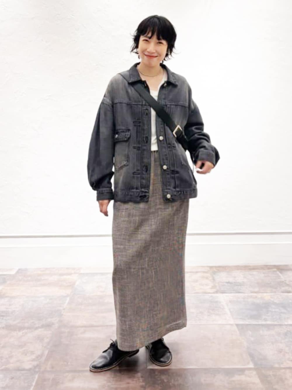 大人かっこよく決まるデニムジャケットなら、ブラックがオススメ。 ブルーとは違って、カジュアルみえしない、 大人なコーデがしあがります。 バッグは斜め掛けした持ち方でも、 スポーティになりませんよ! 着心地もとても柔らかいので、 ハードにも映らないのも嬉しい。 今回はツィードスカートと合わせることで、 柔らかくも大人素敵コーデをイメージしました。