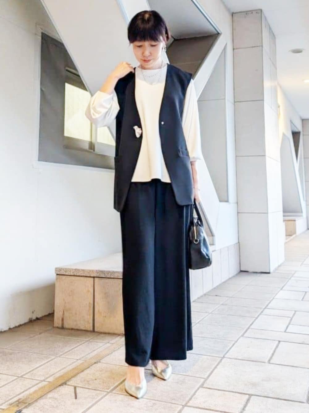 【ベスト】 何といってもシルバーのパーツが素敵なので、合わせるものは極力シンプルにしました。 前を閉めると、わりとタイトめなシルエット。 長すぎず短すぎずの合わせやすいデザインです。セミフォーマルな場面にもピッタリ! 【インナー】0サイズ着用 透け感のない肉厚のカットソーは1枚でもインナーでも幅広いスタイリングに使えます。 0サイズも袖丈しっかり長め、ヒップもしっかり隠れます。スカートやワイドパンツに合わせるのなら着丈すっきりする0サイズがおすすめです。 ※普段S〜Mのトップスを着る方であれば問題なしです 【パンツ】1サイズ着用 落ち感あってスッキリ見えます。ポリエステルですが、シボ感のあるサラサラ生地なので真夏も快適! ワイドなのですが、裾は広がっていないです。 シワにならないのでデスクワークやご旅行用にもおすすめですよ。 【バッグ】 小さすぎず、大きすぎず、必要最低限のものがしっかり入る見た目以上の容量の多さが人気の理由です! キズの目立たない質感のレザー、そしてどんな場面でも使えるシンプルなデザインなので、1つあれば大活躍すること間違いなしですよ。