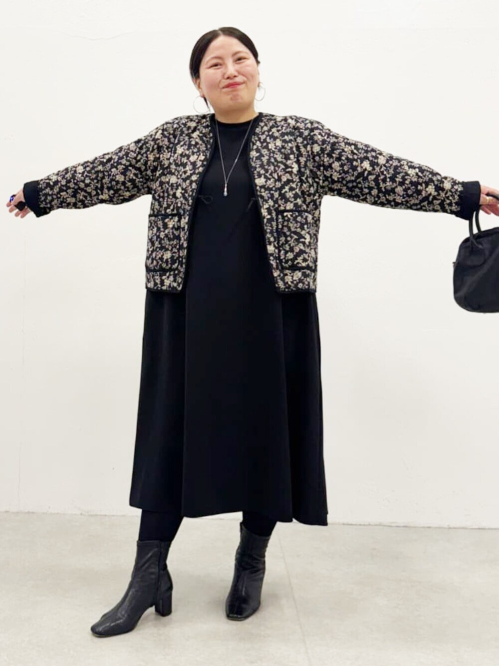 【羽織り】 キルティングで中綿が入ってる羽織りですが、 着膨れせずに着れました。 薄手のワンピースの上から着たので、二の腕やアームは気にならなかったです。 厚手のニットは、私の腕だと着れなそうです。 着丈が短めなので、ワンピースと合わせると すっきり着れました。 お袖が長めなので、折り返して着るのをおすすめします! リバーシブルのブラックがちらっと見てますよ! 【ワンピース】1サイズ着用 安心して着れる着丈です。 前から見るとすねぐらいの着丈です。 お胸で上がるため後ろが長く感じます。 長さがある分、すとんと落ち感あるように見えます。 全体的にちょうど良いサイズ感です。 シワ気にせずにきれますよ!
