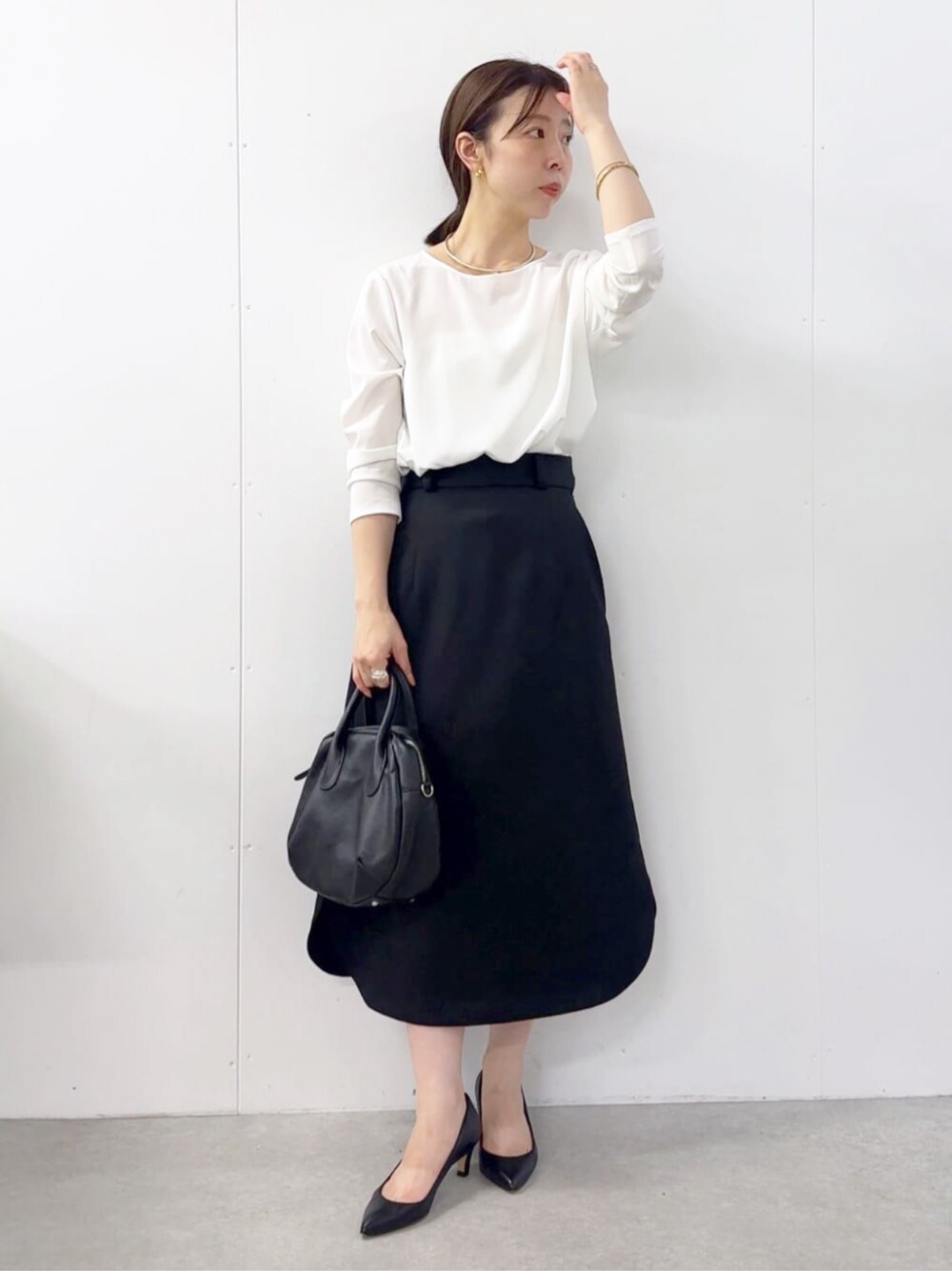 【blouse】Fサイズ とろみ感のある薄手ブラウス。 クルーネックデザインでコーデを選ばず合わせやすいです。 ジャケットやカーディガンのインナーとしても、1枚でも様になります。 秋冬はニットとのレイヤードも楽しめそう。 【skirt】Fサイズ 裾のラウンドカットがポイントのデザインスカート。 絶妙に身体のラインを拾わず、すっきりとしたシルエットで履けます。 シンプルなトップスと合わせると スカートのデザインが引き立ちます。