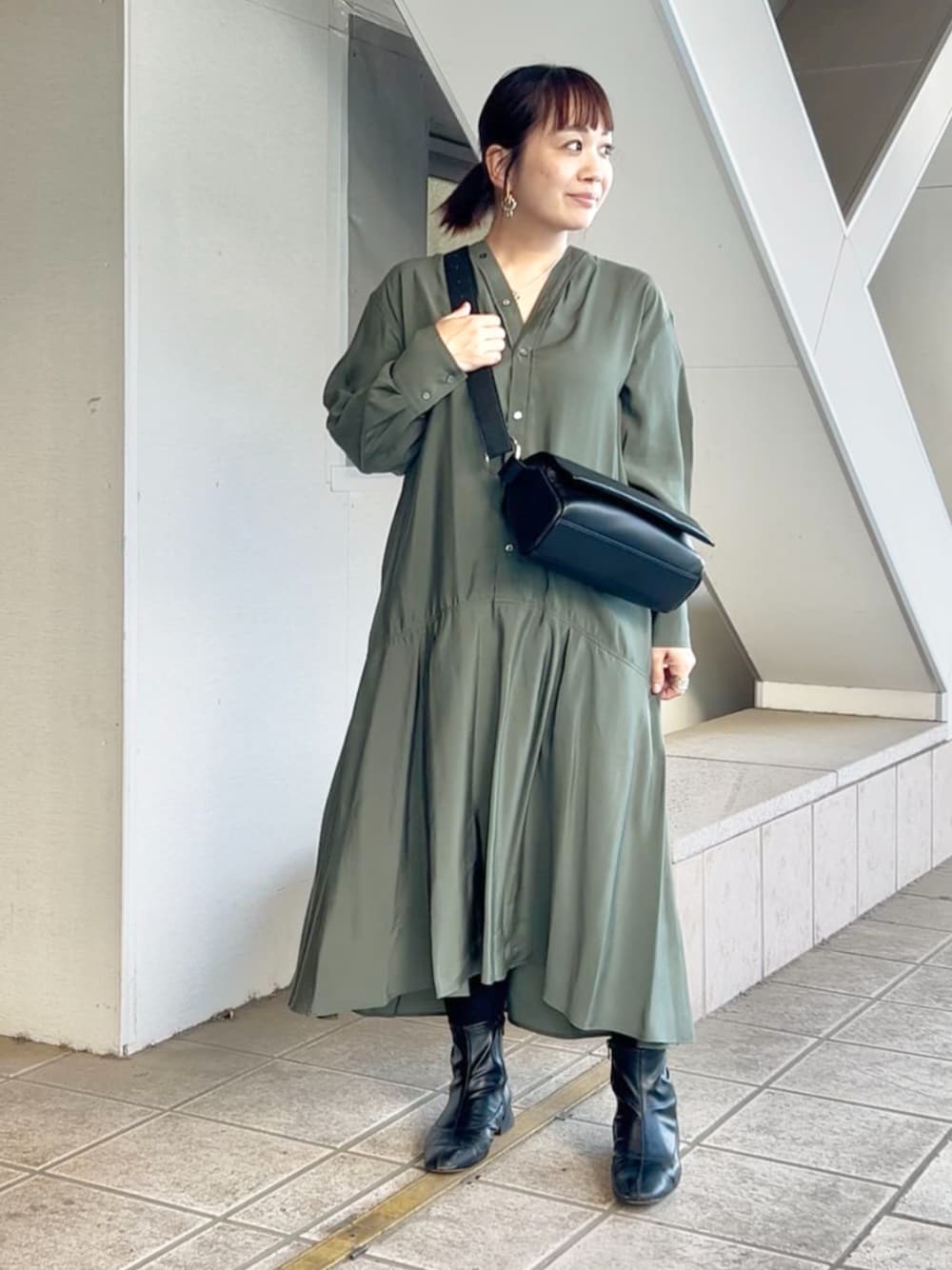【ワンピース】フリーサイズ/カーキ着用 シーズンレスで着られる大人のシャツワンピース。 深めのVネックで首元をすっきり見せてくれますよ。少しとろみのある素材感でセミフォーマルなどちょっとかしこまった場所も着やすいデザインです。 スカートの裾の揺れ感が動くたびにとってもキレイなんですよ。 【バッグ】ブラック着用 大人気!ロングセラーのボディバッグです。 大き過ぎず、小さ過ぎず。 デイリー使いから旅行にも使える使い勝手の良さがポイント。 見た目以上の収納力も◎ レザー素材でカジュアルだけでなく、上品見えするのもスタイルの幅が広がっておすすめ! 太めのベルトも肩の負担もかかりにくいですが別で販売しているベルトを付け替えても良いですよ。