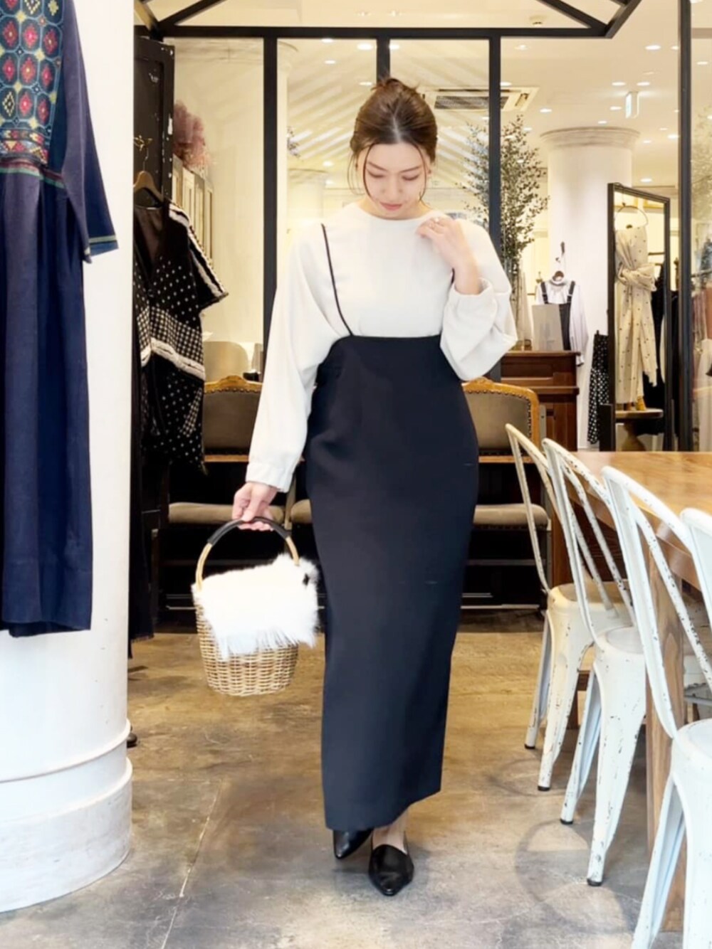 お出かけにお勧めのトロミ素材。 透け感も気にならずに着用出来ます。 ややタイト目なロングスカートは華奢な肩紐で女性らしいデザインです。