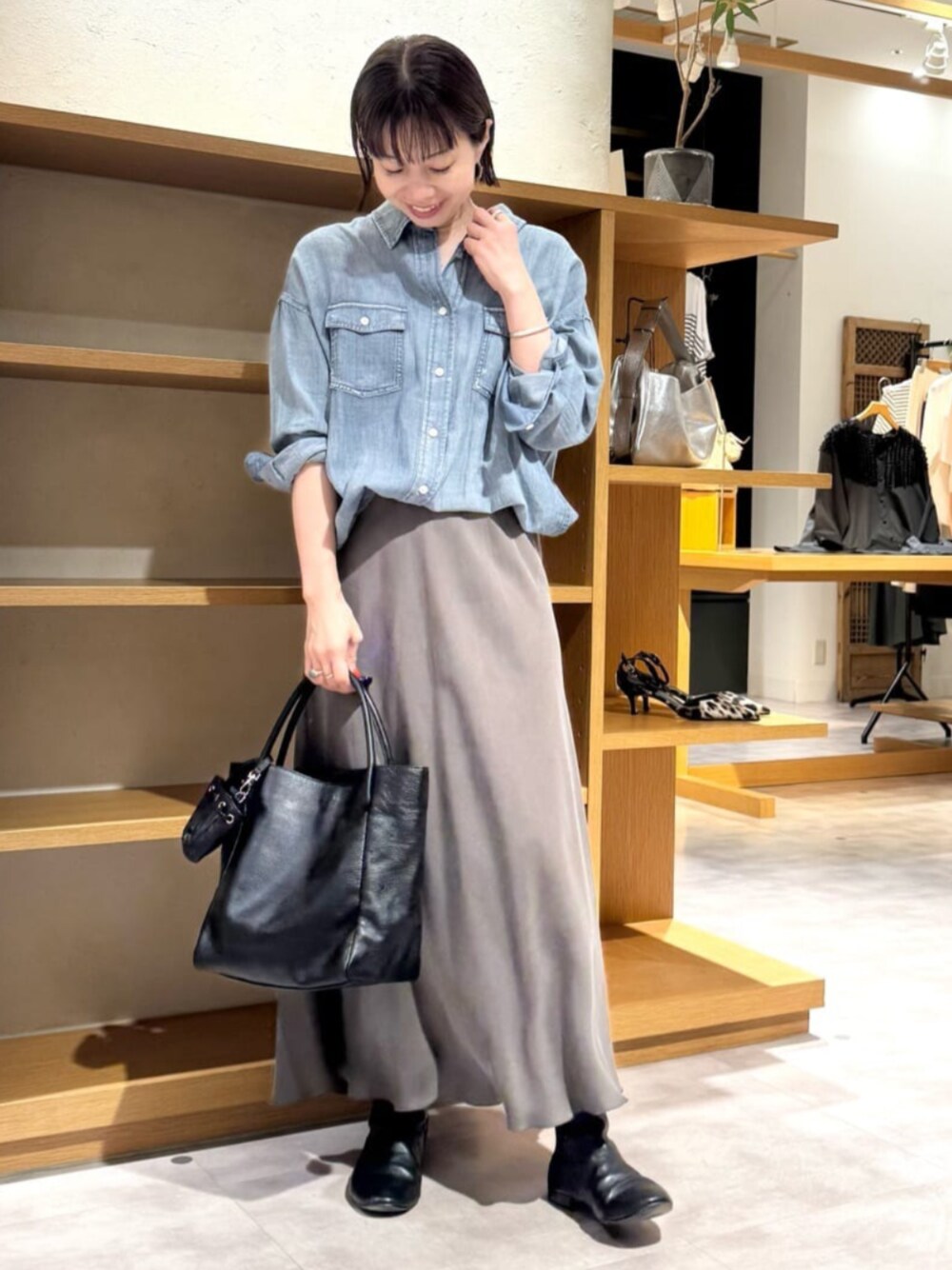 【シャツ】Fサイズ シフォンのような薄手のコットン100%で、 ゴワゴワせずふんわりエアリーな肌触りのデニムシャツ。 柔らかいので、ニットのインナーにもしやすいです。 【スカート】1サイズ着用 腰回りにボリュームが出ず、すとんとしたシルエット。裾に分量を持たせてるので、歩くとヒラヒラと揺れる揺れ感が楽しめます。 ウエストは総ゴムでお腹周りを締め付けず穿けます。 【バッグ】 B4サイズが入る大きさでお仕事やデイリーに使いやすいです。 ハンドルに提げられる小さな巾着に、イヤホンとかが入れられて、すぐ取り出せます。 上はマグネットで留められるので安心!