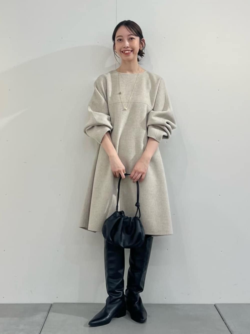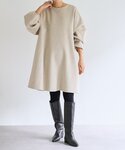【ワンピース】着用サイズ:F 高級コートなどに用いられる贅沢なリバー仕立てのワンピース。 袖にかけて切り替えを入れたミニマルなデザインで 洗練された印象になります。 ベージュ表記ですが、白に近く、オートミールのようにやさしい色合い。 154cmで膝にかかる丈感です。