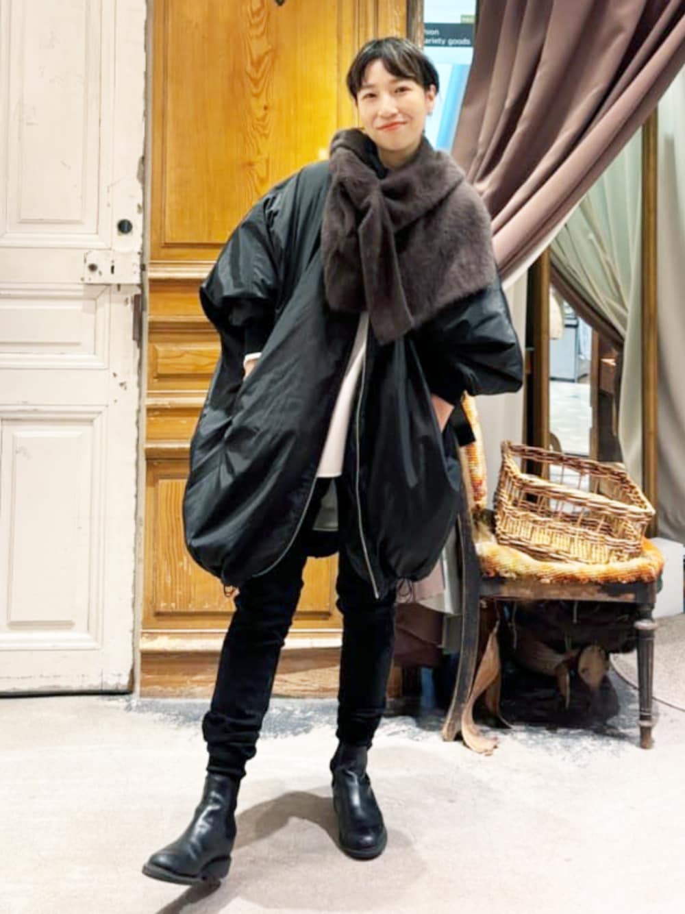 とにかく軽い着心地の中綿ポンチョコートは、 ゆったりシルエットなので、 中にたっぷり着込めます。 ニットなどの厚手はもちろん、 羽織りの上からもオッケー。 ちょっと、そこまで、、な時にも気軽に着られて嬉しい。 裾のドローコードでバルーンシルエットにしてみたり、 ダブルジップなので、ファスナーバランスで、 雰囲気変えるのもオススメ。 今回はポンチョをプラスして、 冬スタイルにしました。