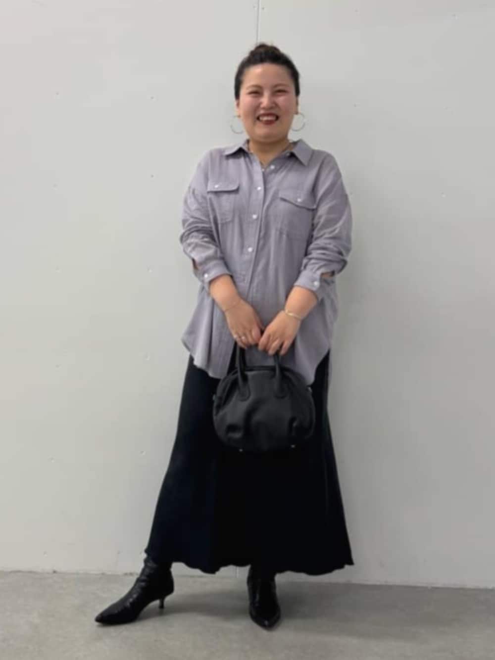 【シャツ】 こちらのカラーはお顔映りが華やかになってうれしい✨ 柔らかいシャツです。 柔らかい生地ですが、身体のライン拾わないので嬉しい。 カラーがムラになっているので絶妙にすっきり見せてくれます。 二の腕きつくなく、ボタンもちゃんと閉めれます。 着丈もお腹やお尻隠せるので、重ね着してもかわいいですよ! 【スカート】1サイズ 履けないと思ってました、、 履けました!!! ウエスト中に紐が付いているので、 ゴム緩すぎて落ちてきちゃう方や、腰が張ってるけどウエスト緩く感じる方は紐で絞ると安心です! お尻のラインや足のラインはそこまで気にならなかったですが、下着ライン出やすい素材なのでそこさえ気をつければ問題無く着れましたよ!!! 後ろの裾に動きがあるので、お尻やふくらはぎ気にならないです
