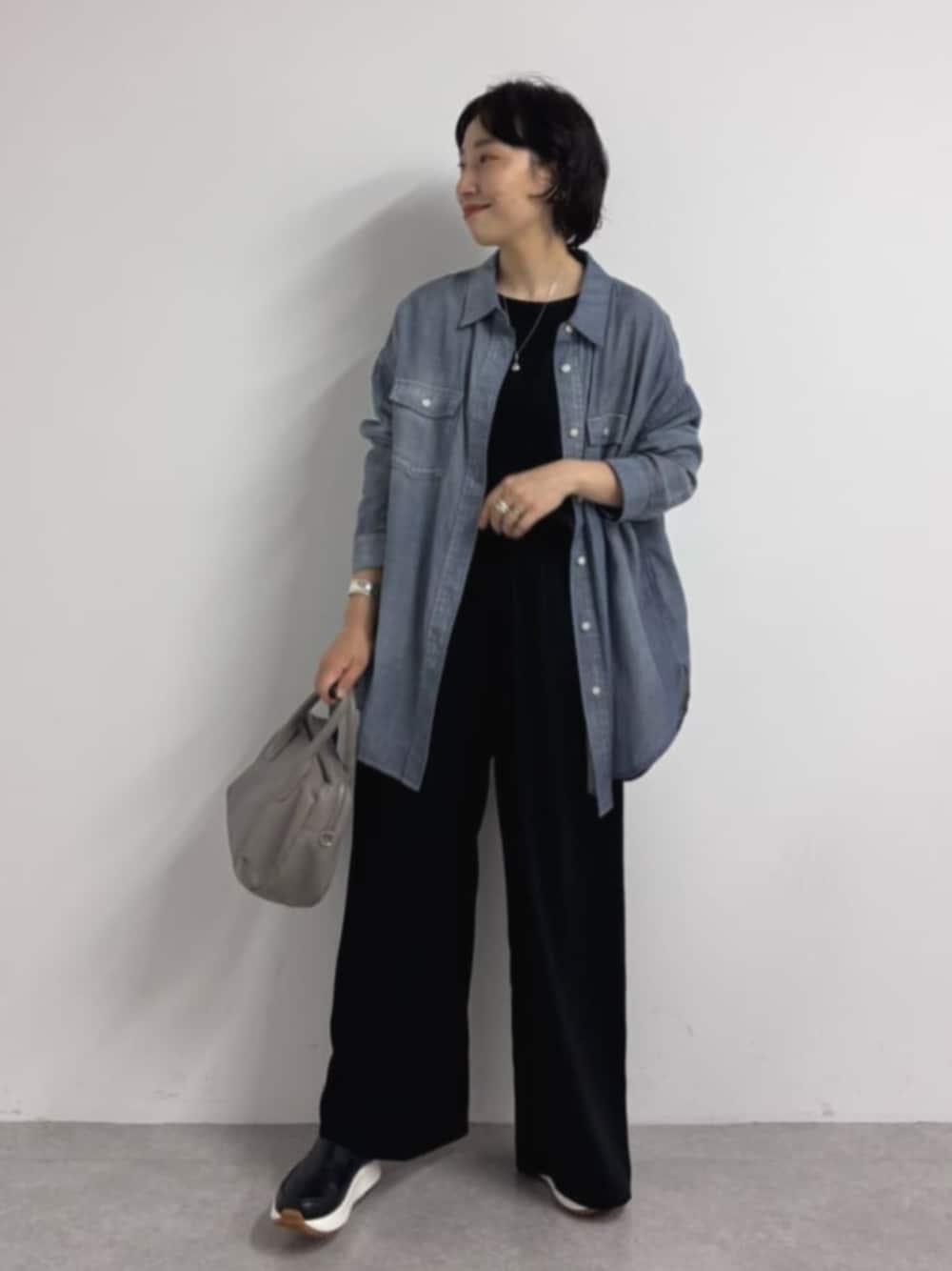 【シャツ】 欲しい時にはいつも完売してる、、とお声の多い『シフォンデニムシャツ』 ジメジメしてると何も羽織りたくないけど、 でも案外、雨って冷たくて羽織りたい。。 そんな時にもオススメです。 濡れてもとにかく軽く、薄手なので乾きも早いですよ。 秋春の季節に着られるシャツでありつつ、 夏本番も着られて、 また、ニットと重ねて冬にも、、、とオールシーズン着られます。 カジュアルだけど、 大人のキレイめな雰囲気も忘れていない1枚です。 長さもたっぷりしているので、 暑い季節は羽織りにして楽しんで下さい。 一緒にコーデした、 【ジョーゼットシリーズ】も、 速乾性があるので、梅雨時期にオススメです♪ カジュアルTシャツと比べて、 サラッとシワにもなりにくく、キレイ見えするので、夏のコーディネートにはオススメ。 スカート、パンツ、どんなボトムにも合います。 同素材のパンツを合わせて、セットアップで着るのもオススメ。