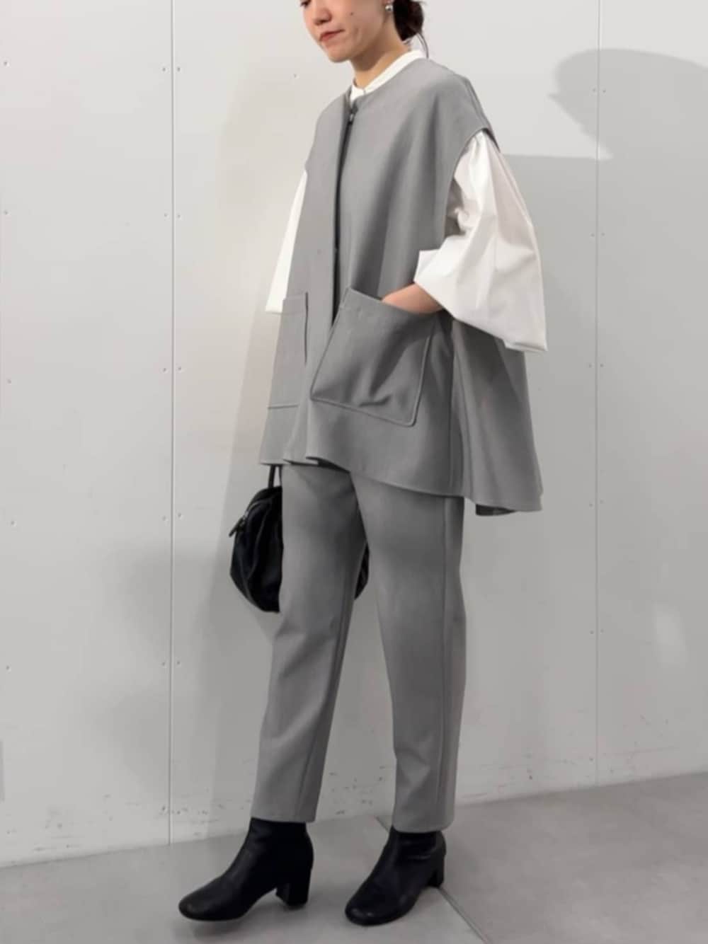 【outer】Fサイズ フレアシルエットが素敵なジレ。 フロントポケットがアクセントに。 ゆとりあるデザインなのでボリュームのあるシャツなどと合わせやすいです。 綺麗め合わせやカジュアルアイテムなどととシーンに合わせて活躍してくれます。 164cmでヒップが隠れる着丈ですので、細身のパンツとも好相性です。 【shirt】Fサイズ 袖口リブデザインでたくしあげやすく、程よいボリューム感が女性らしいシャツ。 164cmでヒップが隠れる安心な着丈ですが、 前後差のあるデザインですのでバランス良く合わせていただけます。 【pants】1サイズ ウエストが太めのリブになっており、すっきりシルエットながら窮屈感なく着られます! ダブルクロス素材で程よくハリがあり、腰回りも安心◎ 164cmで 1サイズは足首が隠れる程の安心な着丈。 腰回りもゆとりがあり、ぴったりせず着られます。