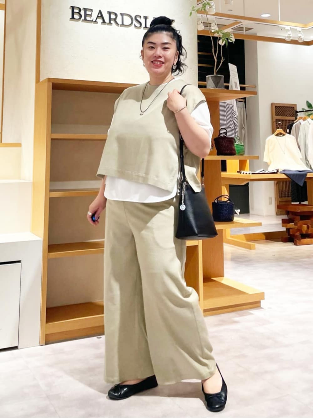 【vest】 着用サイズ : 1 前後どちらでも着られる2WAYショートベスト。 ゆったりとした身幅と裾スリットで、裾にボリュームのあるトップスやワンピースとの重ね着もし易いデザイン。 【blouse】 着用サイズ : F 程よいゆとりと、ストレッチ性のある生地を使用していて着心地のいいアイテムです。 裾はラウンドカットで、パンツにもスカートにも合わせやすくなっております。 【pants】 着用サイズ : 2 人気のウエストリブシリーズです。 私は2サイズを着用していて、腰周りやヒップも無理なく履けました。 着丈はくるぶしにかかる長さです。
