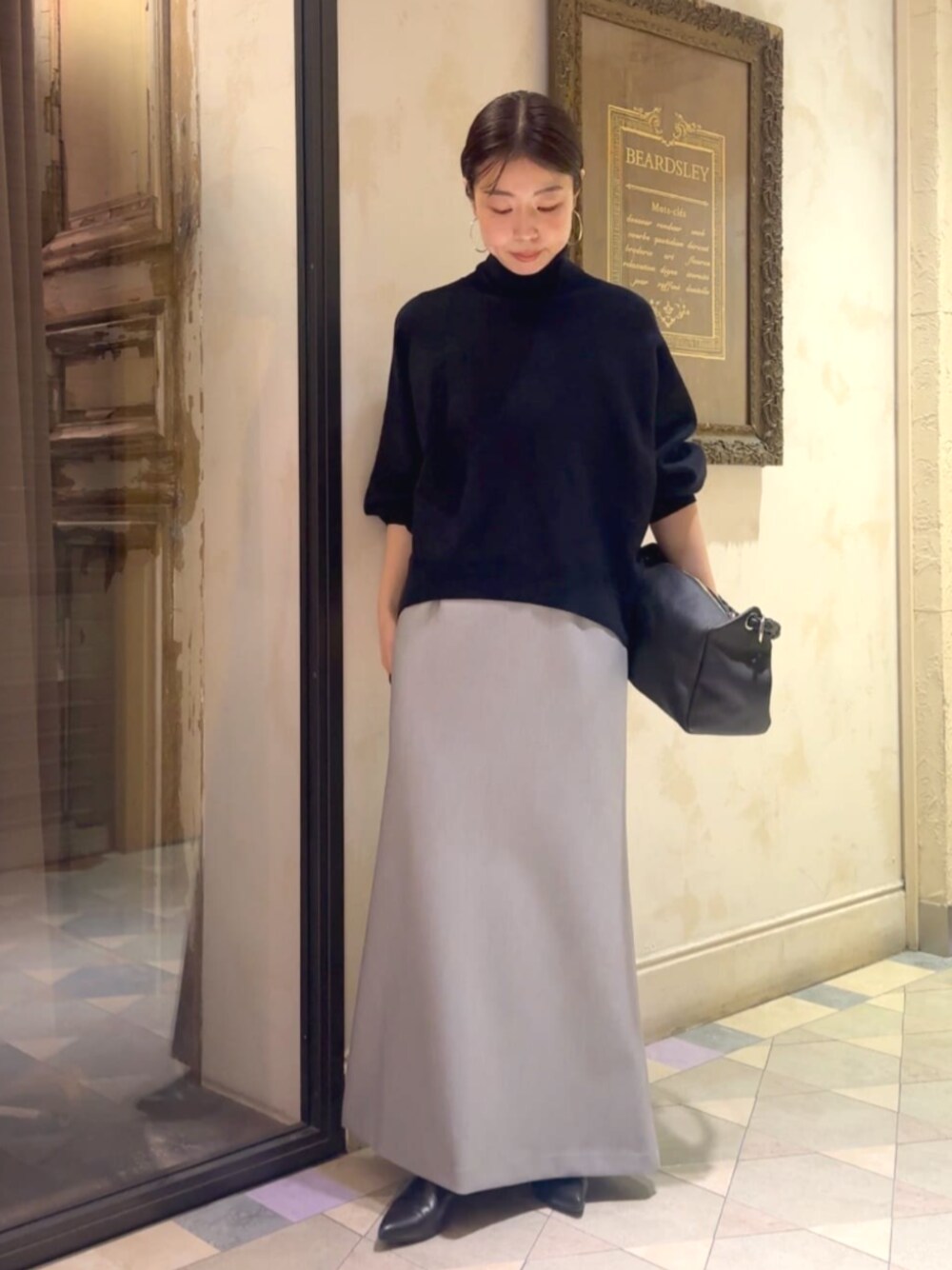 【knit】Fサイズ ビアズリーで昨年もご好評の ハイネックドルマンニットが今年も登場。 毛丈の長くないニットで、チクチクも感じにくいお素材。 ショート丈なのでスカートやワイドパンツとも相性抜群です。 タートルニットのピタッとする概念を覆される ゆったりシルエットが嬉しい一着。 【skirt】Fサイズ すっきり広がらないシルエットのロングスカート。 タイトながら体のラインを拾いすぎないのも嬉しいポイントです。 きちんと感も出るので、お仕事スタイルにもおすすめ。