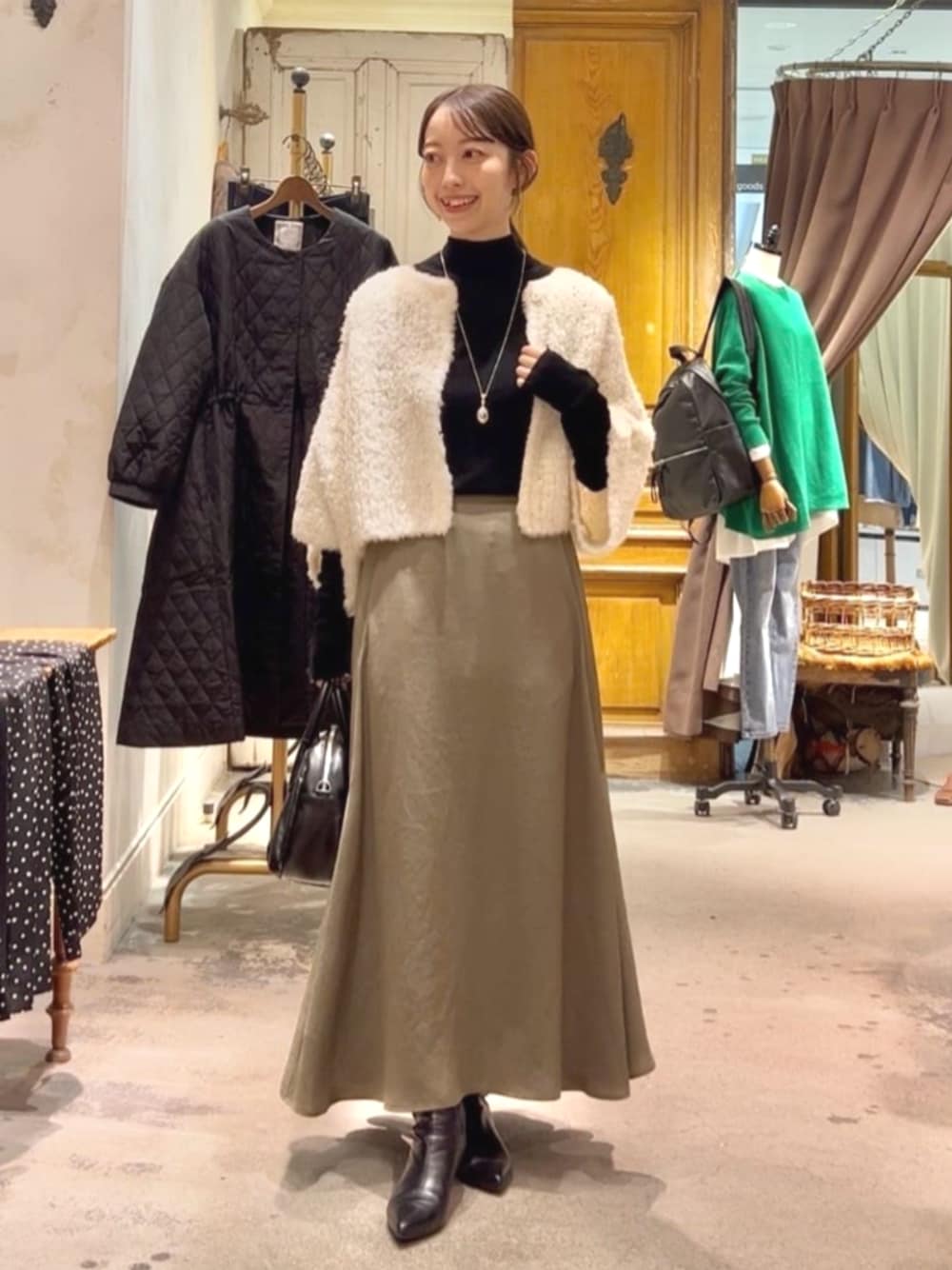 【ニット】着用サイズ:F ふわふわと柔らかい極上の肌触りが魅力のカーディガン。 ローゲージなので、体にフィットしすぎず抜け感のあるシルエットです。 ショート丈なのでボレロ感覚で着ていただけます◎ ボタンを留めて、トップス風に着るのもオススメです。 【スカート】着用サイズ:0 マーメイドシルエットが綺麗なスカート。 光沢感のある生地感と揺れ感が綺麗見えします。 ストンと落ち感があるので、体型を広わずスッキリ見せてくれますよ◎ 後ろウエスト部分のみゴム入りて着脱しやすく、ポケット付きなのも嬉しいポイント。 154cmで0サイズを着用し、くるぶしにかかるくらいの丈感。