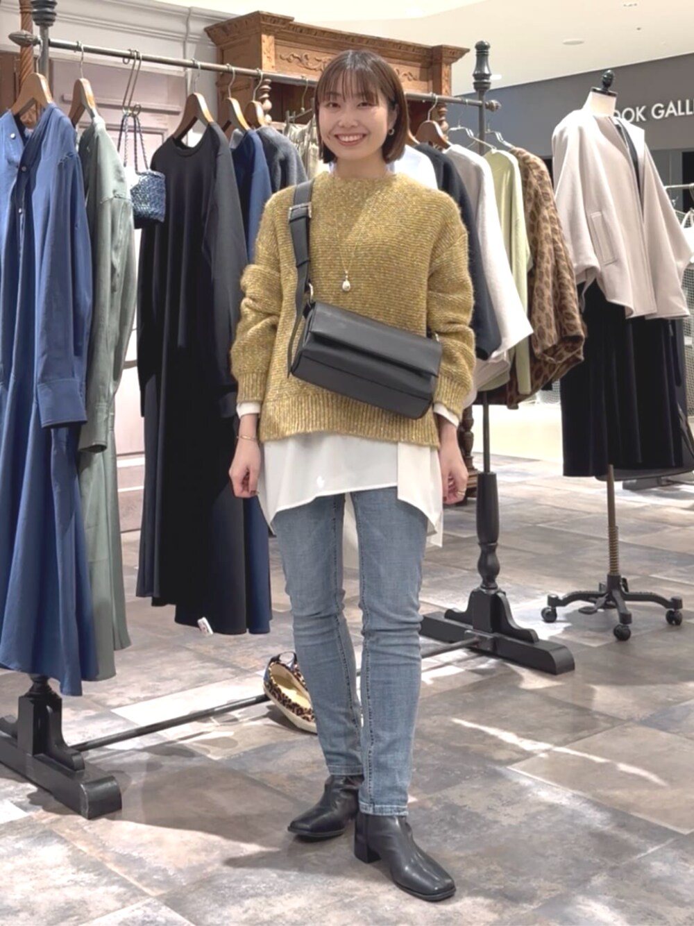 色んなカラーの糸がミックスされたニットだけど、ベーシックなカラーの糸が混合しているので派手にならず、シンプル派でも着やすいのが、私の推しニットポイントです! tops: 様々なカラーがミックスされたニット。 冬はお洋服が暗かったりシンプルになりがちですが、このニットなら秋冬のコーデが華やぎます。 やや厚みのある生地感でした。 腰にかかるコンパクトな着丈なので、低身長さんもボトムスを問わない丁度良い丈感でした。 inner: レイヤードのインナーに使える万能ブラウス。 さらっとした薄手のジョーゼットのような生地感。 前後差のあるシルエットで、2サイズ展開で1サイズを着用し、前はふとももにかかる着丈、後ろはふとももが隠れるくらいの着丈でした。 bottom: ストレッチ性の高いデニムパギンス。 ウエストゴムで紐付きなので、サイズ感も調節しやすいです。 着丈のあるトップスやチュニックと一緒に合わせたり、ワンピースの下からチラッと覗かせるのがおすすめです。