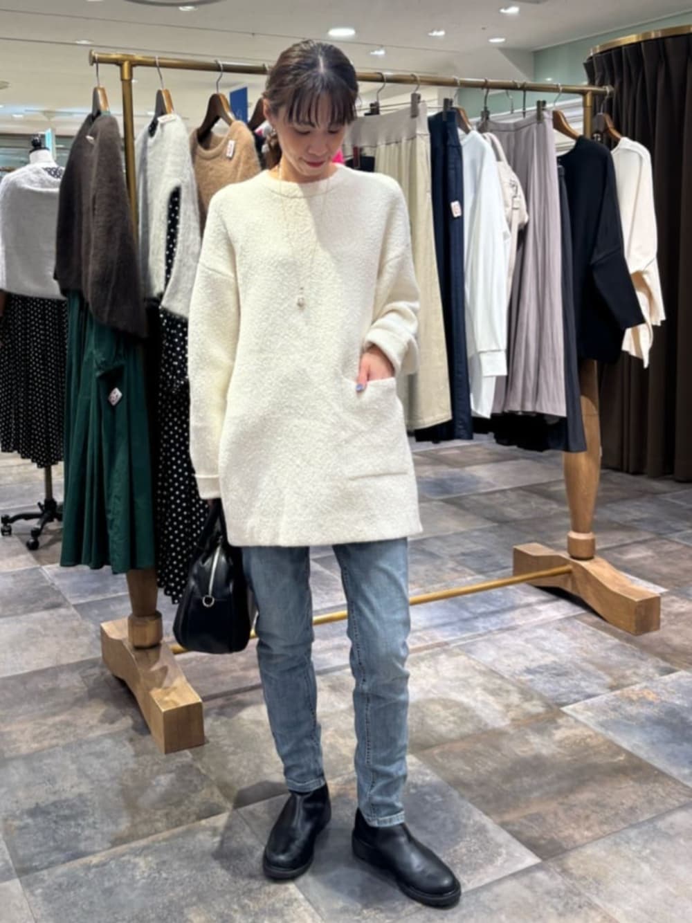 ニット ふんわり肌触りで生地のチクチクが気にならなず気持ち良く着ていただけます。 腰下まで着丈がありヒップライン隠れる長さでスリムなボトムやワイドパンツにもコーディネートが出来ます。