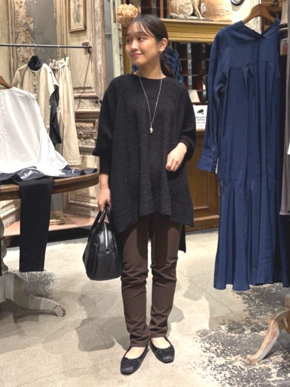 【トップス】 フリンジが華やかなプルオーバーニット。 ラグランスリーブで肩周りはスッキリと、袖口が長めのリブなのでメリハリのあるシルエットです。 サイドスリット入りで前後差があるデザインで、149cmで前は太ももにかかるくらい、後ろは膝上くらいの着丈です。 【パンツ】着用サイズ:0 伸縮性に優れ、窮屈感のないストレスフリーな履き心地です。 チュニックやワンピースの下に合わせるなど一本持っていれば間違いないアイテム。