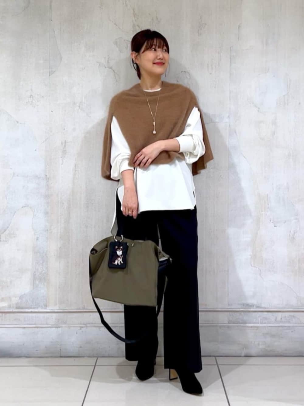 【ニット】 フォックスとカシミアのファーニットポンチョ。 軽くて温かいので、 コート着るほどでもないかな…という日にもピッタリ! 【トップス】サイズ1着用 袖先が少しポワンとしているのでシンプル過ぎず ポンチョとも相性よく着ていただけます◎ 【ボトム】サイズ1着用 太過ぎず細過ぎずのセミワイドシルエットは どんなボリュームのトップスにも合う万能パンツ。 【バッグ】 裏地にワンちゃんたちがプリントされた 心くすぐるバッグ◎ 軽くて柔らかいので気軽に持てます。 ハンドルにはDogポーチをつけています。 【ポーチ】 キュンとしてしまう可愛いワンちゃん刺繍のポーチは 丸カンで付け外しできるので、バッグのハンドルに付けてみました。