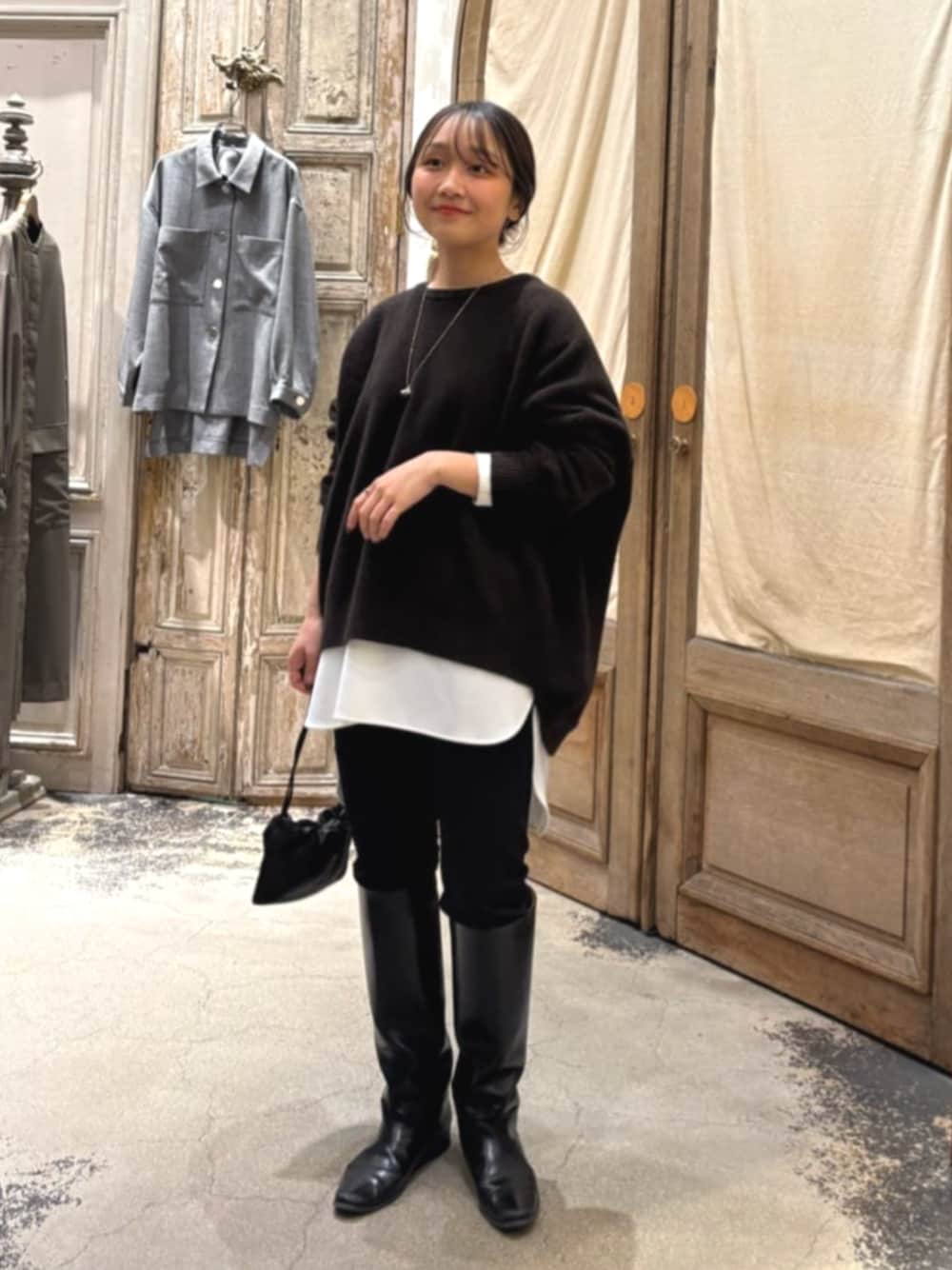 【トップス】 ヤク混のあたたかいニット。厚みはそれほどなく、ドルマンスリーブと後ろ下がりの裾がリラックス感のあるシルエットに。 レイヤードスタイルはもちろん、スカートやワイドパンツとも相性抜群のニットです。 【インナー】着用サイズ:1 一枚でもラフすぎなくて、レイヤードにも使えるロンTを探していました! いつもは0サイズですが、細身のパンツを穿くと太ももが気になったので今回は1サイズを着用しました。 袖口はまくっても落ちてこないのと、 前後差のあるサイドスリットがスッキリとした印象なので 用途によってサイズを変えるのも良さそうだと思いました!