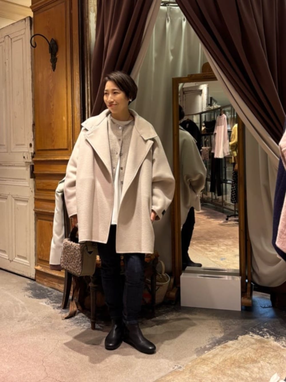 【Tブラウス】 秋冬春と万能なこちらは、 プラスするだけでキレイ見えする一枚。 重ね着アイテムとしても万能です。 全体が暗く見えちゃうな。。 そんな時に、一枚挟むことで明るくなります♪ いつものインナーをこれに変えるだけ、 それだけで垢抜け、キレイに仕上がるので重宝しています♪ 白でも透けにくいのが嬉しい。 シワにもなりにくく、 お洗濯もしやすいですよ。 今回はニットとリバーコートを重ねて、 キレイめカジュアルにしました。 【デニパギ】 伸縮性抜群なデニパギは、 着痩せも叶う一本。 デニムとパギンスを合わせたパンツで デイリー使いにオススメです。