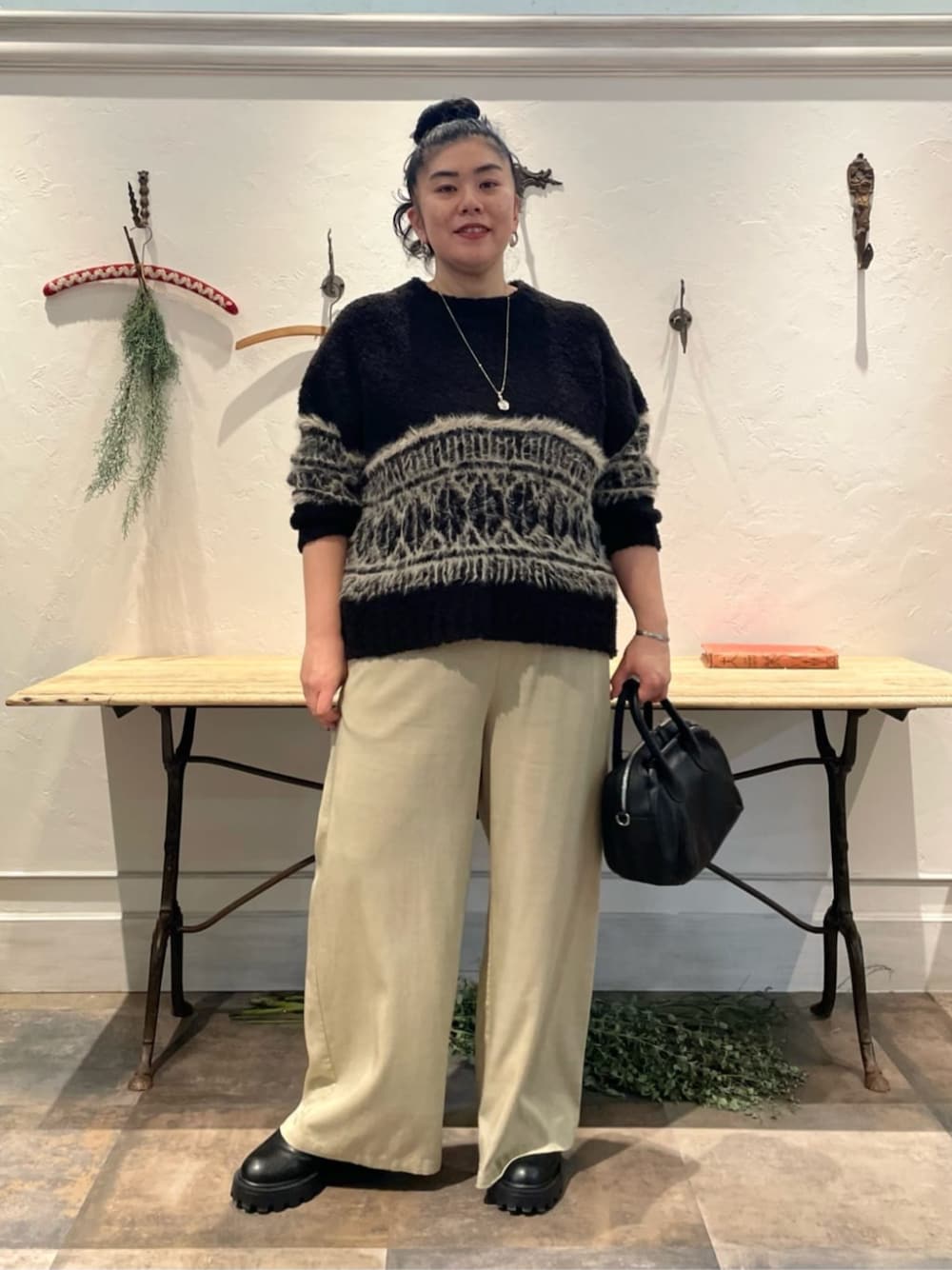 【knit】 着用サイズ : F 身頃と袖に大きくフェアアイル柄をあしらった、存在感のあるニットプルオーバー。 ゆったりとしたシルエットでラフに着られます。 【pants】 着用サイズ : 3 ビアズリー人気のウエストリブパンツ。 新しいサイズ“3”が登場。 166cmの私は今までのサイズだと丈が足りなかったのですが、今回はフルレングスで履けました。 また、腰回りも今までよりも余裕があります。