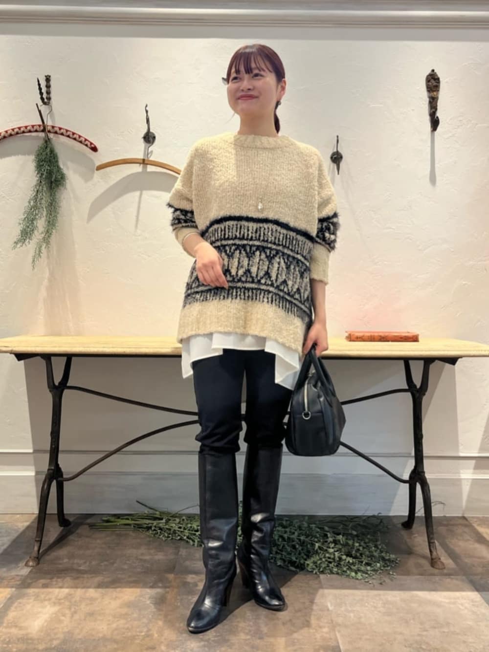 トップス ミックスヤーンを使用し、ふわっとした肌触りで着心地の良いニット。 フェアアイル柄が一枚で様になります。 ヒップが隠れるくらいの着丈があるので暖かいです。 インナー 薄手のブラウスでレイヤードにぴったりなアイテムです。 ニットのチクチクが気になる時や、長さが欲しい時にも重宝します。 パンツ 1サイズ 伸縮性のあるデニムパンツ。 ウエストのみならず生地が全体的に伸びるので履きやすいです。 バッグ コロンとした形ですがマチ(約9.5cm)がしっかりあるので必要最低限の荷物はしっかり入ります。 しぼ感のあるレザーで使いやすいです。 ショルダーベルト付き。