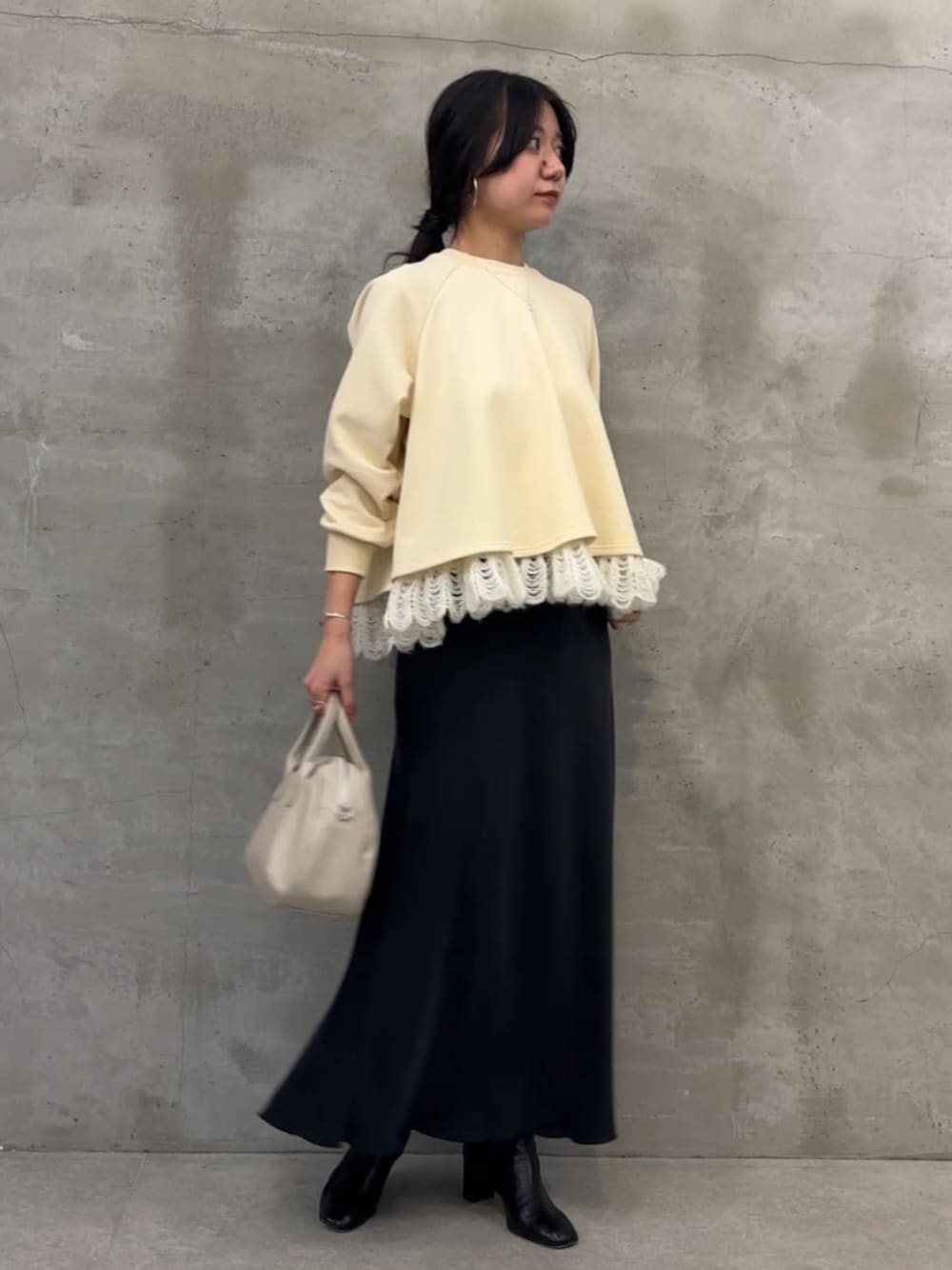 【トップス】 裾に立体感とやわらかさのあるタム糸を使用した、透かし編みのニットレースあしらったカットソー レイヤードしているように見えるデザインなのでこれ1枚でお洒落に決まります! 一般的なレースよりも温かみがあり、ニットならではの雰囲気が素敵です。 【スカート】着用サイズ1 マーメイドシルエットがポイントのスカート 腰周りがスッキリして見えるのが嬉しいです。 光沢感があって、上品な印象になります。