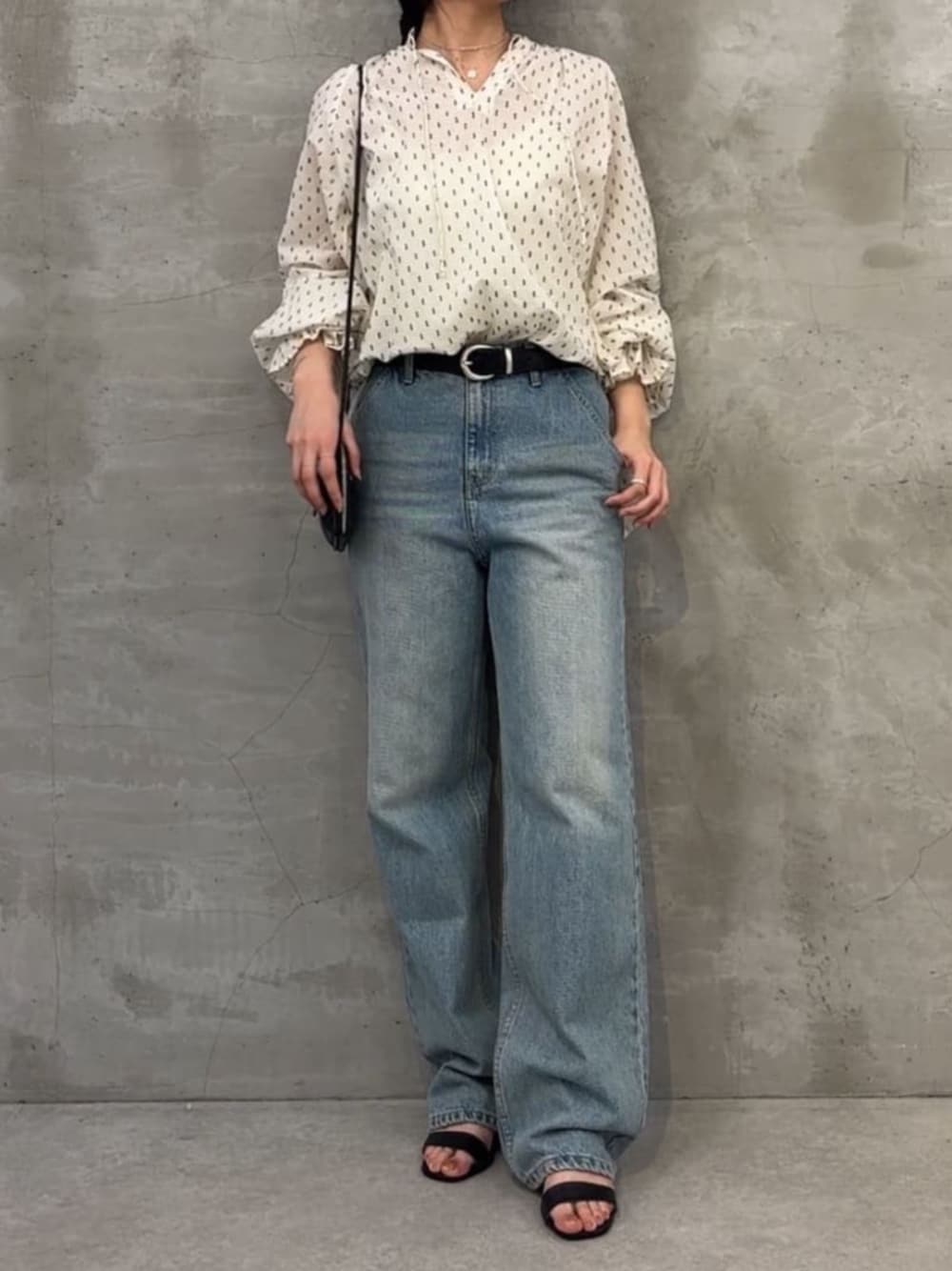 【トップス】 ギャザーをたっぷりと寄せたジャガード織りのブラウス ドットのように見えて、細かな文様のジャガード織りになっています。袖口はゴムで伸縮性があり、細かく寄せたシャーリングと共布のリボンがついてるのがポイント◎ すっきり開いた襟元にも、共布の紐がついていてアクセントになります。 【パンツ】 程よい落ち感とダメージ加工のあるデニムストレートなシルエットは、スッキリ見えして脚長効果抜群! 164cmでヒールのブーツを履いて脚の甲にしっかりとかかる丈感です。
