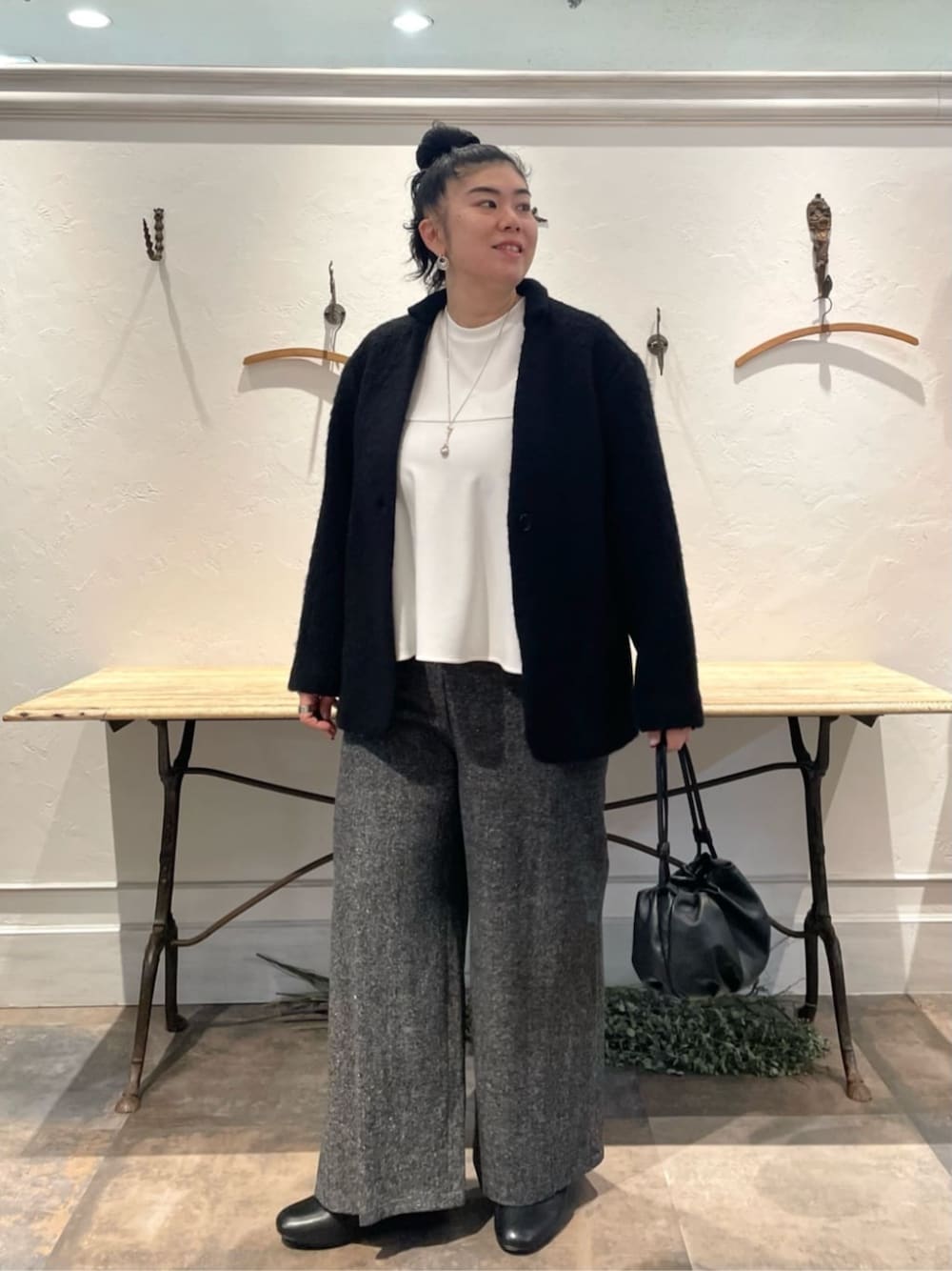 【outer】 着用サイズ : F ふんわりとした毛足と上品な光沢が魅力のアルパカ混のウールジャケット。 衿はラペル部分をノーカラーにしているので、すっきりとしたデザインです。 ゆったりとしたシルエットでインナーに厚手のニットも着られます。 洗濯 : 手洗い可 伸縮性 : なし 裏地 : あり 【tops】 着用サイズ : F 伸縮性のある生地を使ったカットソー。 肩まわりはスッキリですが、フレアラインなので体のラインを拾わずに着られます。 洗濯 : 手洗い可 伸縮性 : あり 裏地 : なし 【pants】 着用サイズ : 2 ウエストリブシリーズに、秋冬にぴったりの温かみのあるウール素材が登場。 1番大きい2サイズを着用していて、窮屈感なく履けました! 洗濯 : ドライクリーニング 裏地 : あり