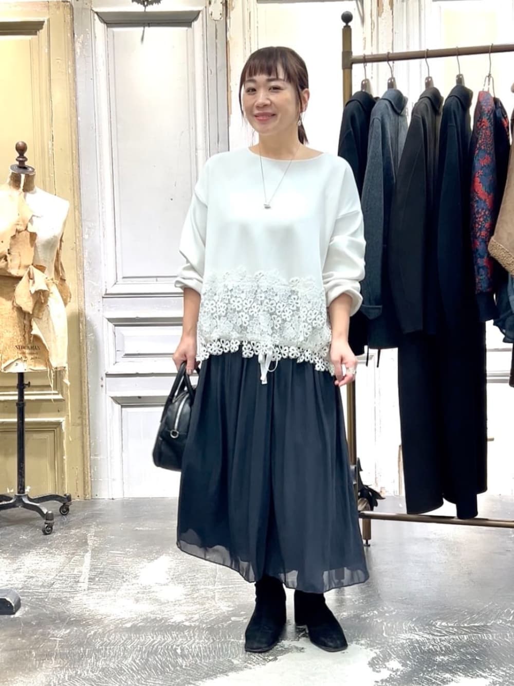 【トップス】ホワイト/フリーサイズ着用 人気の裾レースシリーズ! ダンボールカットソー素材で登場しました! もちっとした伸縮性のある生地で着心地も抜群。長いシーズンで着られそうです◎ 裾に通したリボンを絞れば、シルエットに変化も出せます◎ ボトムを選ばず合わせやすいので幅広いスタイルで楽しめますよ。 【パンツ】1サイズ/ブラック着用 スカートの様に柔らかくて軽いですが、なんとパンツなんです! 透け感のある柔らかなシフォン素材をたっぷりと使用したギャザーパンツです。 スカートのようなデザインで女性らしくフェミニンに。 ウエストはゴム仕様で着脱も楽ちんですよ。 1サイズは足首は隠れるほどです。冬はタイツとブーツで合わせたり。 【バッグ】ブラック着用 コロンとしたフォルムが可愛いミニバッグ。 見た目以上の収納力でペットボトルも入ります(横に収納) 両面には外ポケットもついており、スマホや鍵などすぐに取り出したいものなど、出し入れも楽ちん! ショルダーベルト付きで2way仕様になってます◎