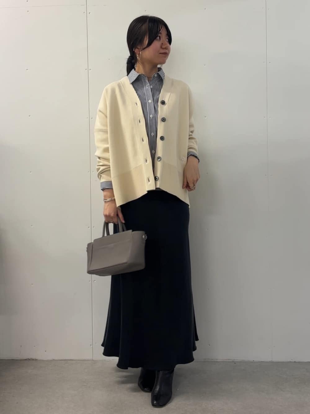 【トップス】 ビッグシルエットのカーディガン サイドにはスリットが入っているため、オーバーサイズでもスッキリ見えます。やわらかい色味のアイボリーはきれいめなコーデにも、カジュアルなコーデにも相性抜群◎ 【インナー】 ブルーのストライプが着映えするショート丈のシャツ 短めの着丈はインをしなくてもバランスが良くすっきりと見えます!1枚でももちろん、カーディガンとの重ね着は相性抜群◎ 【スカート】着用サイズ1 光沢感のある生地で軽さと艶がポイント、後ろに切り替えを入れたマーメイドスカート 落ち感のある生地で広がりすぎないシルエット ◎164cmでくるぶしが隠れるくらいの着丈です。 【バッグ】 上質な革を使用したギャザーショルダーバッグ 短いショルダーと長いショルダーがついていて 便利◎ 日常からきれいめまで幅広いコーディネートに合わせていただけます。
