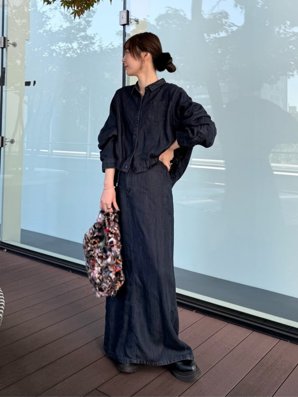 デニム地のショートシャツとスカートを セットアップで着てみました✳︎ シャツは前後差のある着丈ですっきり。 裾にドロストリボンが入っているので、 シルエットに変化をつけることもできます◎ スカートにはスリット入りで歩きやすいのが嬉しい。 とろみがある素材なので 生地がとても柔らかくて着心地も良いし、 デニムですがカジュアルになり過ぎない 上品な雰囲気で着ていただけます◉