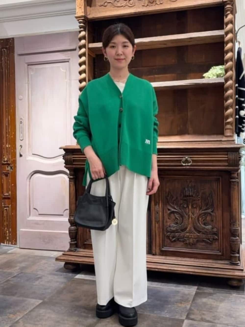<カーディガン> 鮮やかなグリーンのカーディガンは前を閉じたら一枚着のような雰囲気になります。 チクチク感なく着れます。 サイドなスリットが入っているのでオーバーサイズですがすっきりとするシルエットです。 ボトムも選ばず使えます。 <トップス> レイヤードに使いやすい薄手のトップスです。 インしたい時ももたつかない素材感です。 首周りが開きすぎていないので首周りが開きすぎなトップスに重ねるのもおすすめです。 <パンツ> センタープレスがあるのでキチンと見えします。オンオフ兼用できます。 裏地がないのでシーズンが長く履けます。 タイツなどを重ねてもごわつきません。