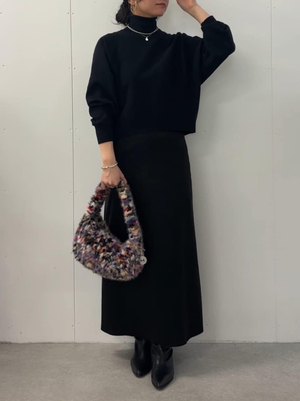 【トップス】 着回しやすいハイネックのドルマンニット 長すぎない丈は、インしなくてもバランスがよく見えます!チクチク感がなくて、着やすいのも嬉しいポイントです。 【スカート】着用サイズ1 マーメイドシルエットが魅力のバックテールスカートにスエード調素材が登場! ほんのり光沢があって、肌触りの良い生地は上品さがあります。 【バッグ】 冬らしいふわふわとしたファーバッグ カラフルな色合いはコーデのポイントになります。ブラックコーデの差し色にぴったり◎