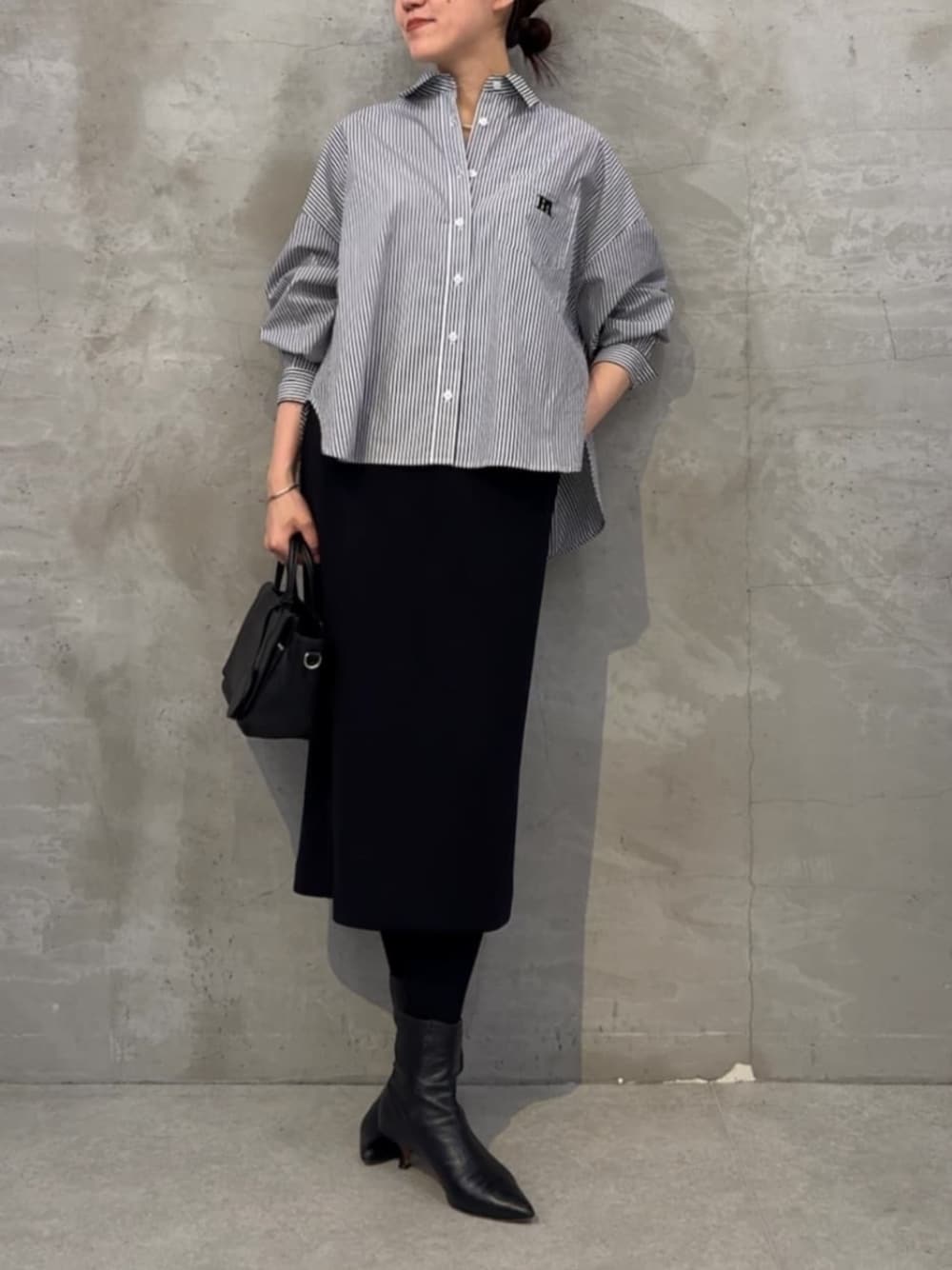 【shirt】Fサイズ 腰にかかる程のショート丈でインせずにすっきり着られます。 ドロップショルダーで胸周りや肩周りもゆとりあるデザイン。 サイドスリットが入るので、横に広がって見える心配もありません。 【skirt】 1サイズ 164cmで 1サイズはふくらはぎが半分ほど隠れる着丈。 ストレッチ抜群なダンボール素材ですので、 きちんと見えしつつもリラックス感のある着心地で日常使いしやすいです◎