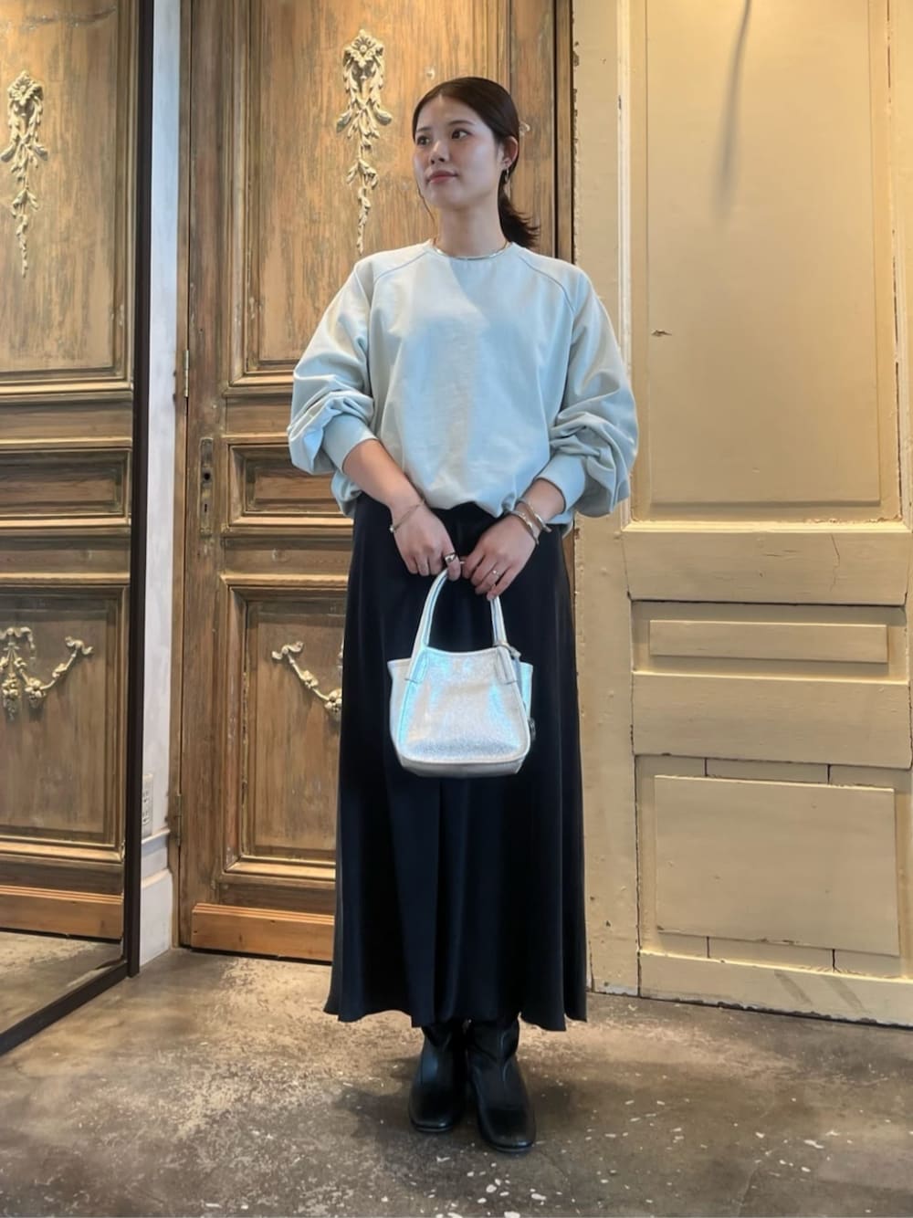 【tops】 爽やかなミントグリーンが目を惹く、コットン素材のプルオーバーカットソー。 フロント裾にギャザーを寄せてふんわりと丸みを出した、バルーンシルエットが女性らしい一枚◎ 袖口にもギャザーを施し、立体感のあるパフスリーブに仕上げることで、スウェット素材ながらもカジュアルになりすぎない印象に! 【skirt】 落ち感のあるマーメイドスカート。 後ろのタックのおかげで、気になる腰周りやヒップがカバーされて安心して履いていただける1枚。 【bag】 《MARCO MASI / マルコマージ》 2010年にイタリアのミラノでスタートしたブランド。長年ラグジュアリーメゾンの生産を手掛けてきたブランドで、製品や素材に関する深い知識を活かし裁断から縫製まで自社工場で仕上げるコレクションは職人技に裏打ちされたクオリティーと機能性の高さで人気を集めています シルバーのカラーが爽やかさにアクセントを付けてくれるから、ポイントにしたい時にピッタリなバッグ!