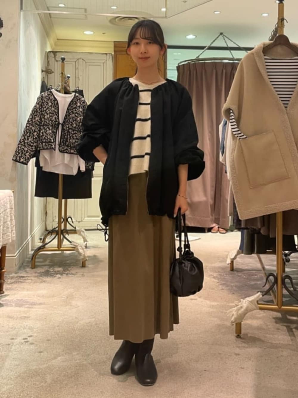 【トップス】Fサイズ FOXウールで真冬まで暖かく着られるVネックニット。とても柔らかく肌触りもふわふわです◎ 腰くらいまでの丈感でバランス良く着られます。ブラウスやシャツとレイヤードしやすいのもポイントです! 【アウター】Fサイズ たっぷりギャザーが立体的なブルゾン。 ジップやドロストコードを使ったスポーティな要素がありながらも、ゆったりとした女性らしいシルエットにしてくれます。 ボリュームがあるように感じますが、ギャザーと軽めの素材で重たさを感じません。 【スカート】0サイズ スウェード素材のマーメイドスカート。 後ろにタック入りで、動きが綺麗なだけでなくヒップのラインもカバーしてくれます。 落ち感のある素材なので、広がらずストンと綺麗なシルエットにしてくれます。 裏地付きで暖かく、真冬まで安心です。