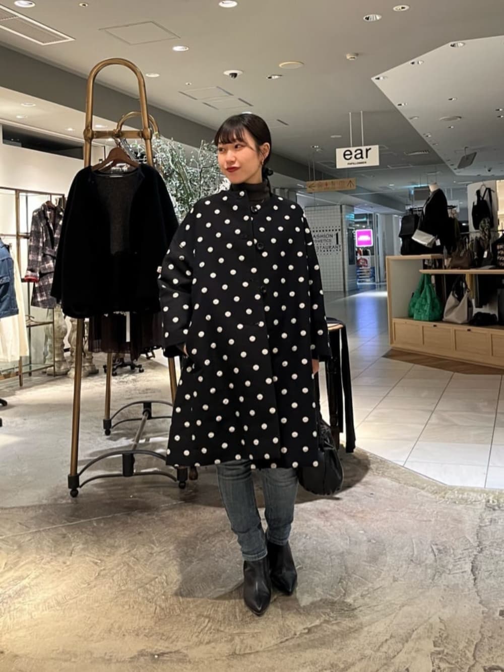 \ 151cm 低身長 / ドットのコートがワンポイントのコーディネート。 シンプルなコーディネートにも華やかさをプラスしてくれます◎ とっても軽い着心地で、 151cmで膝くらいの丈感でした。 ロングブーツ合わせも◎ 小柄さんはワンピースとして着るのも良さそうです。